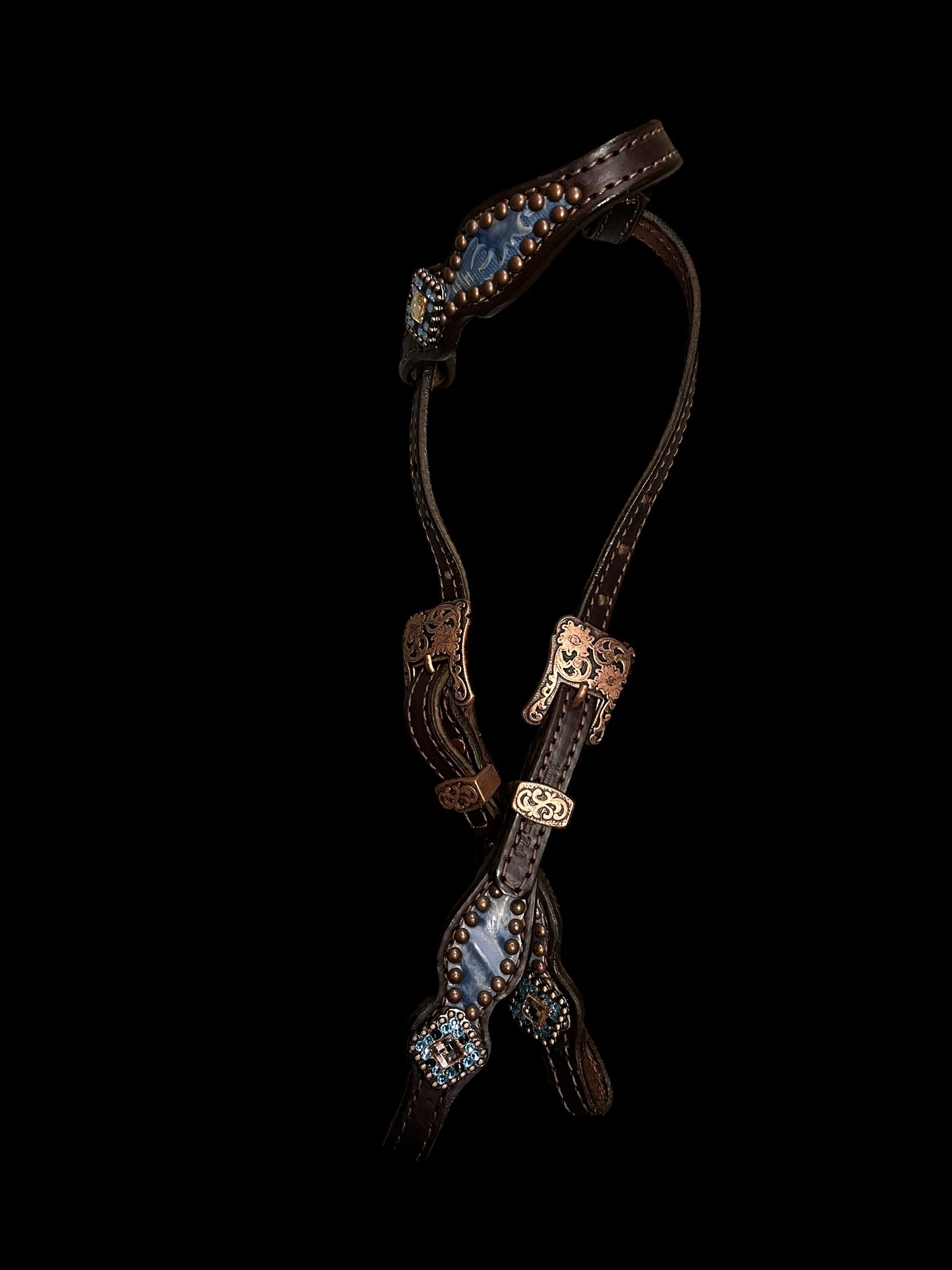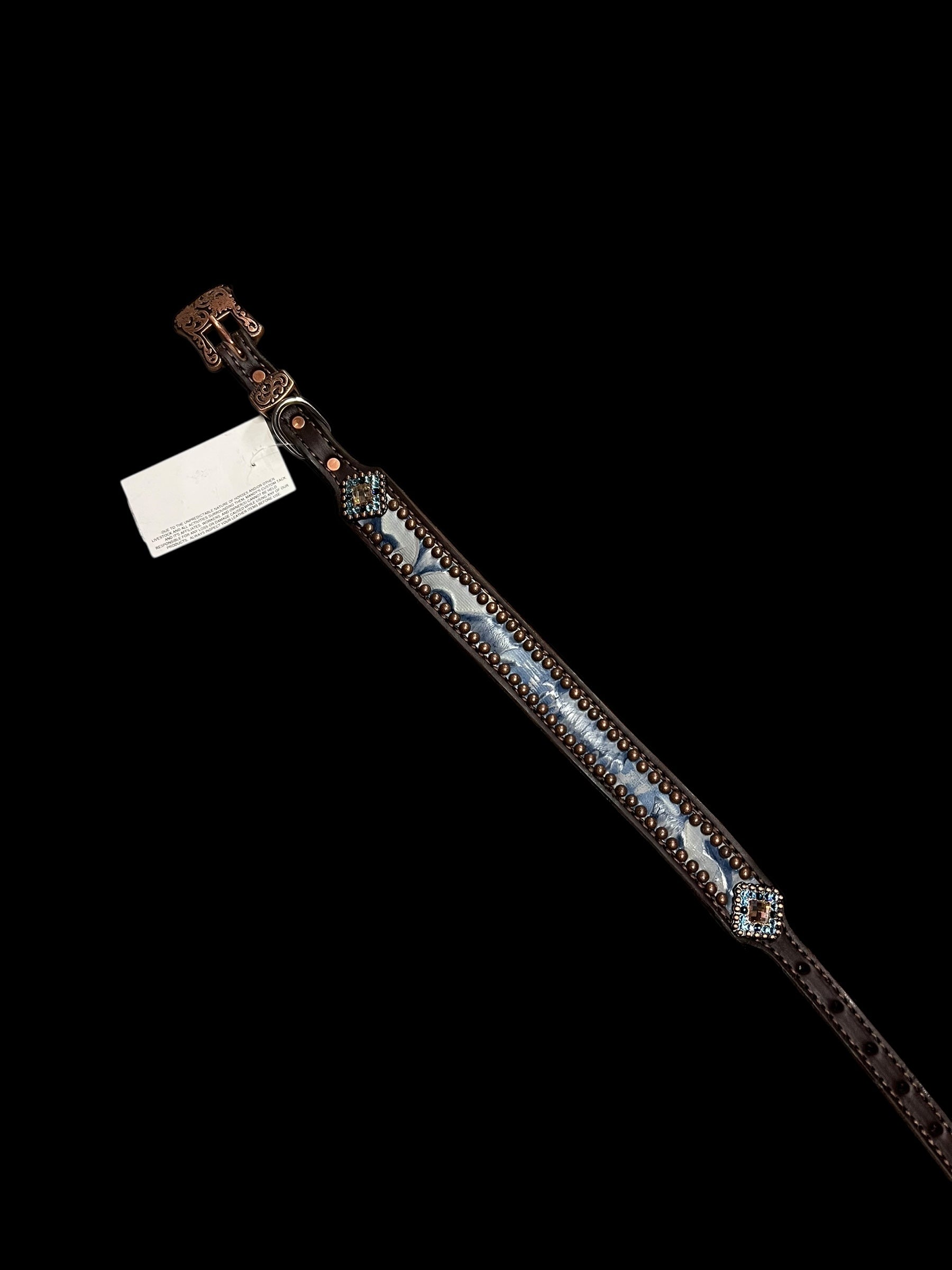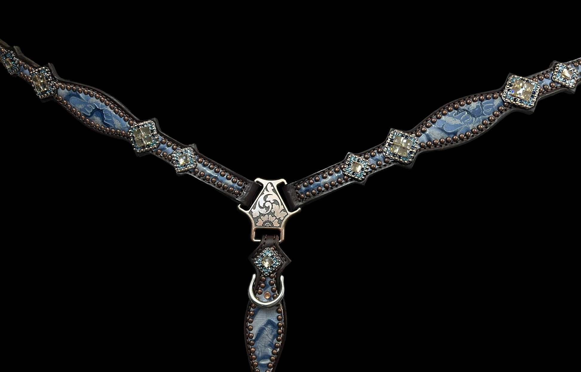 This ensemble features chocolate english bridle leather with blue laredo embossed leather overlay, copper spots, and conchos with genuine rhinestones.