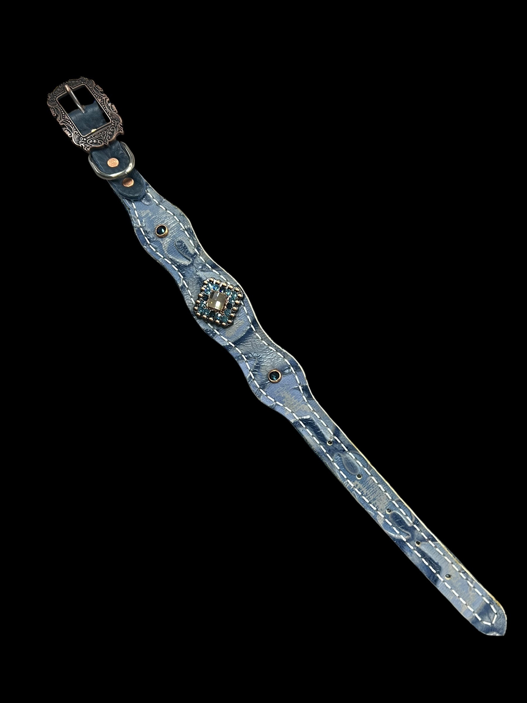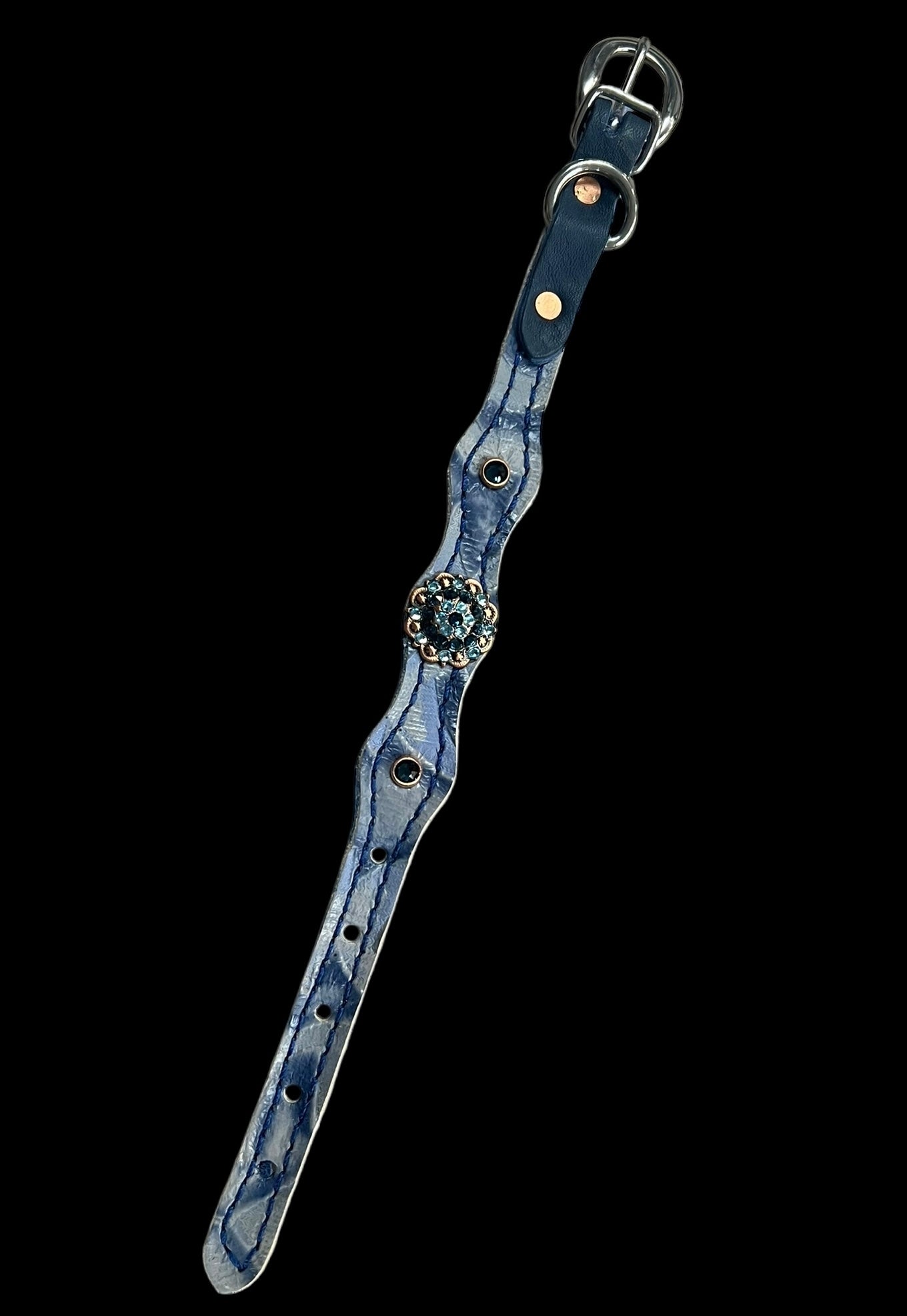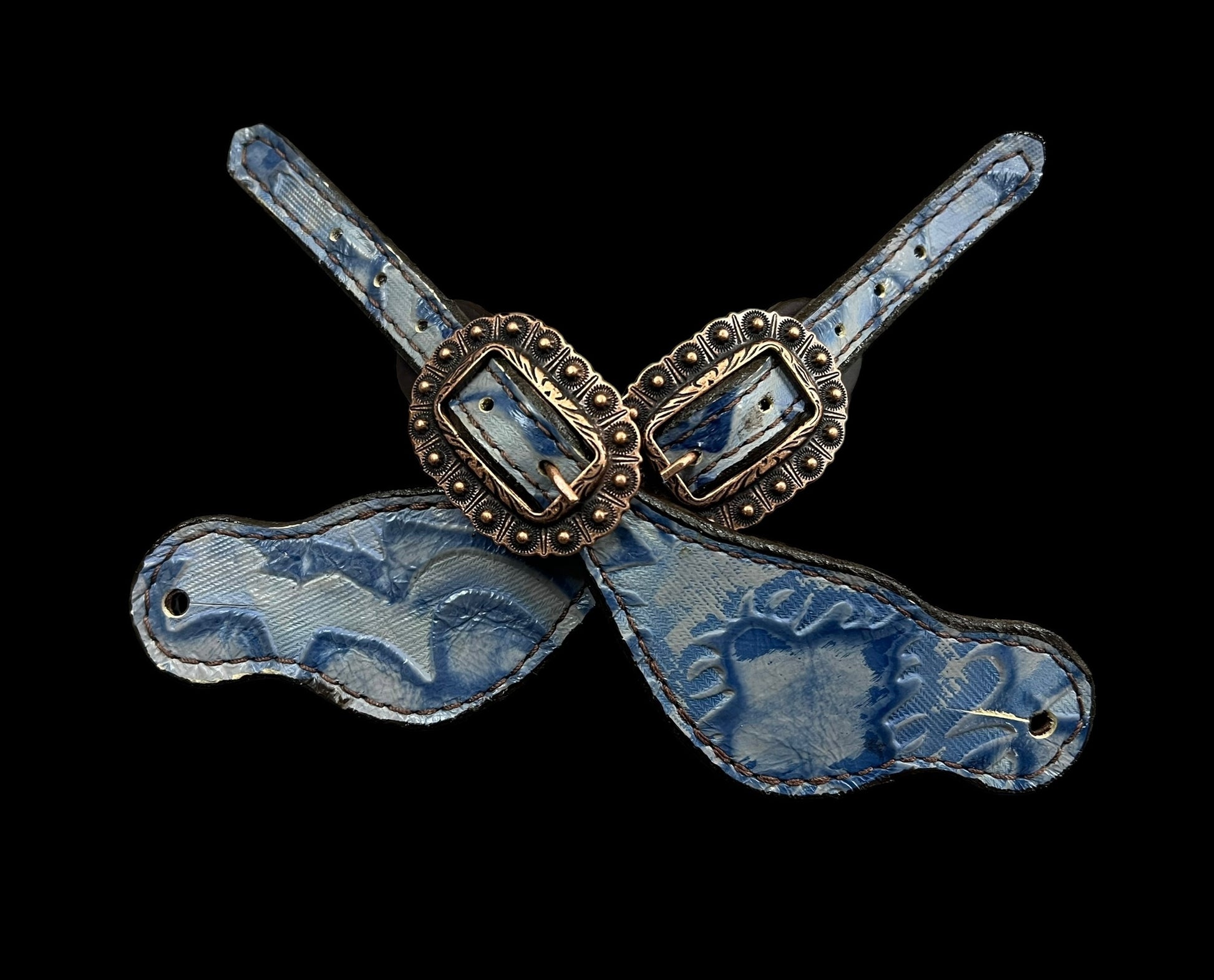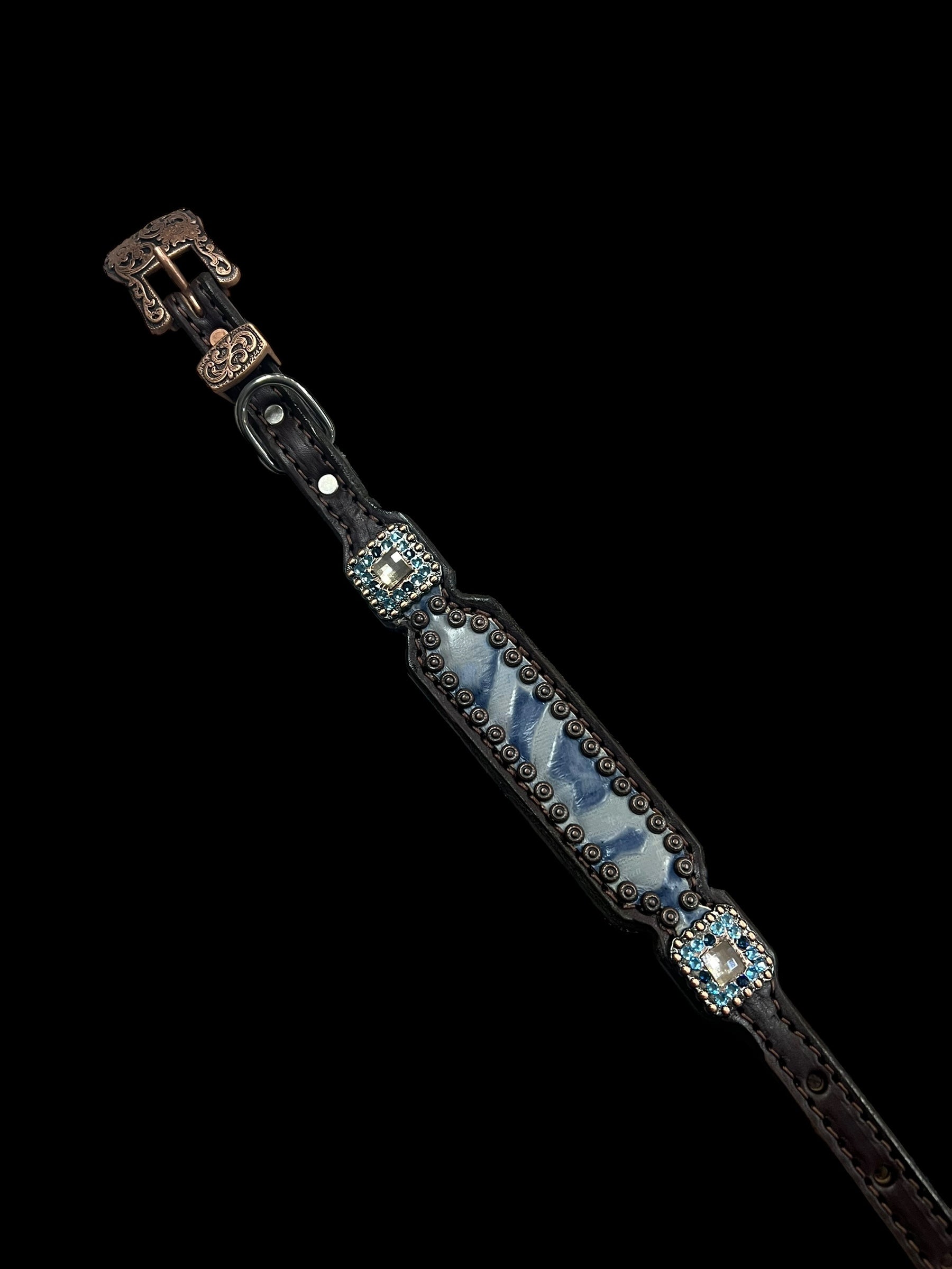 This ensemble features chocolate english bridle leather with blue laredo embossed leather overlay, copper spots, and conchos with genuine rhinestones.