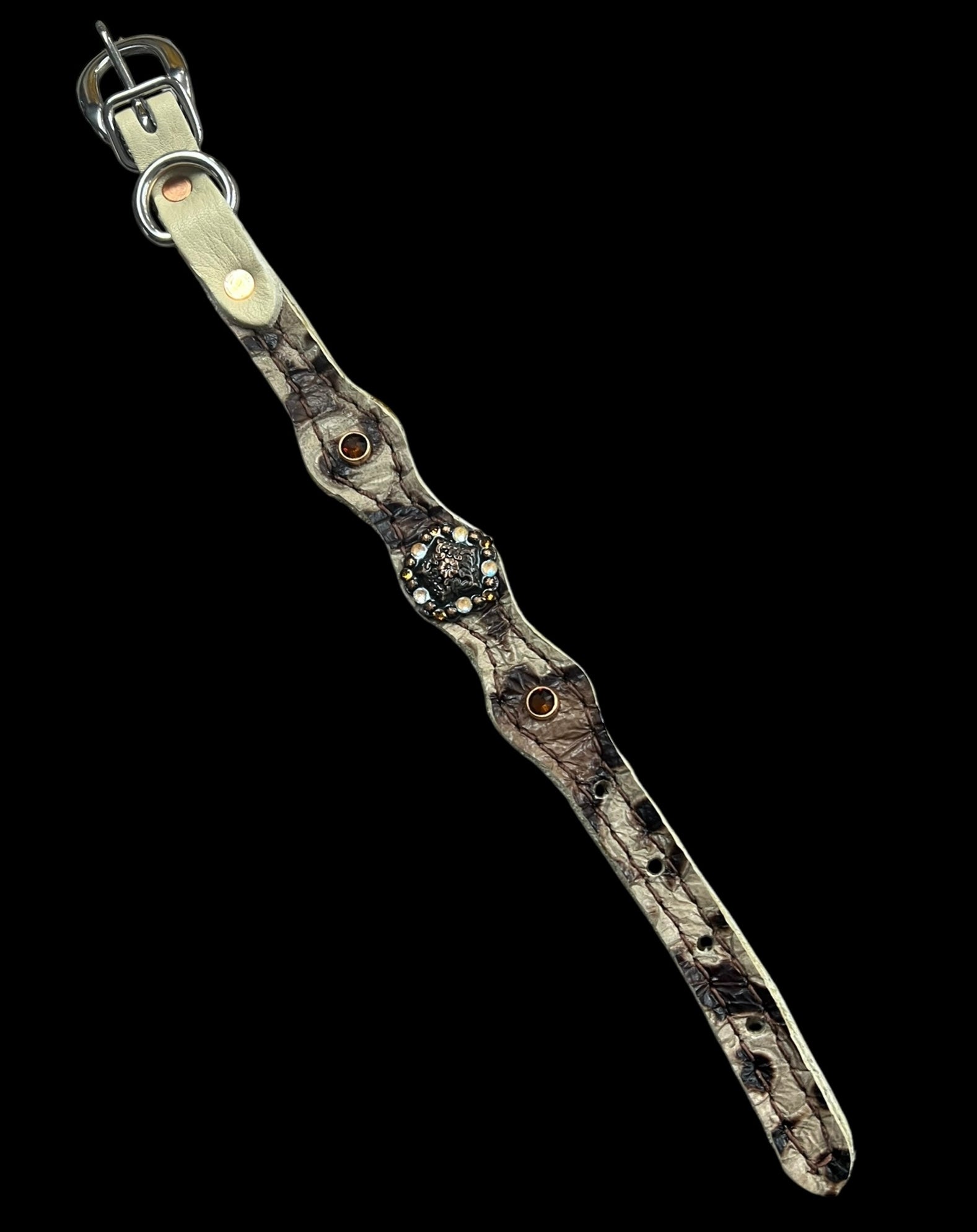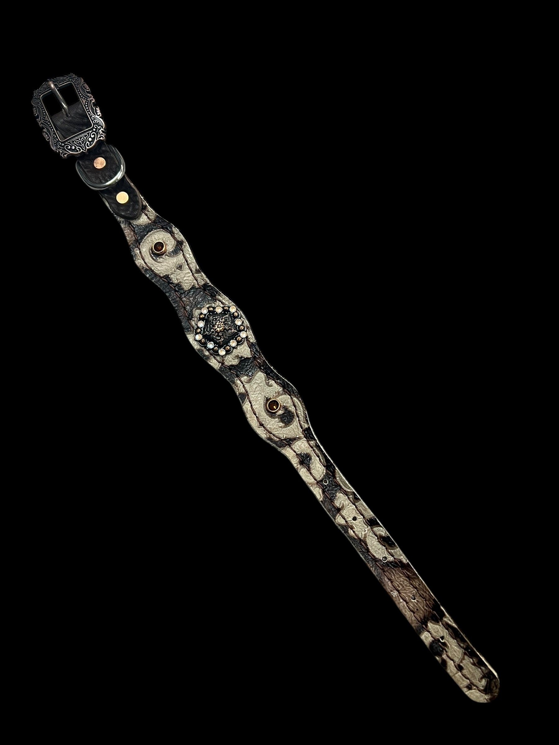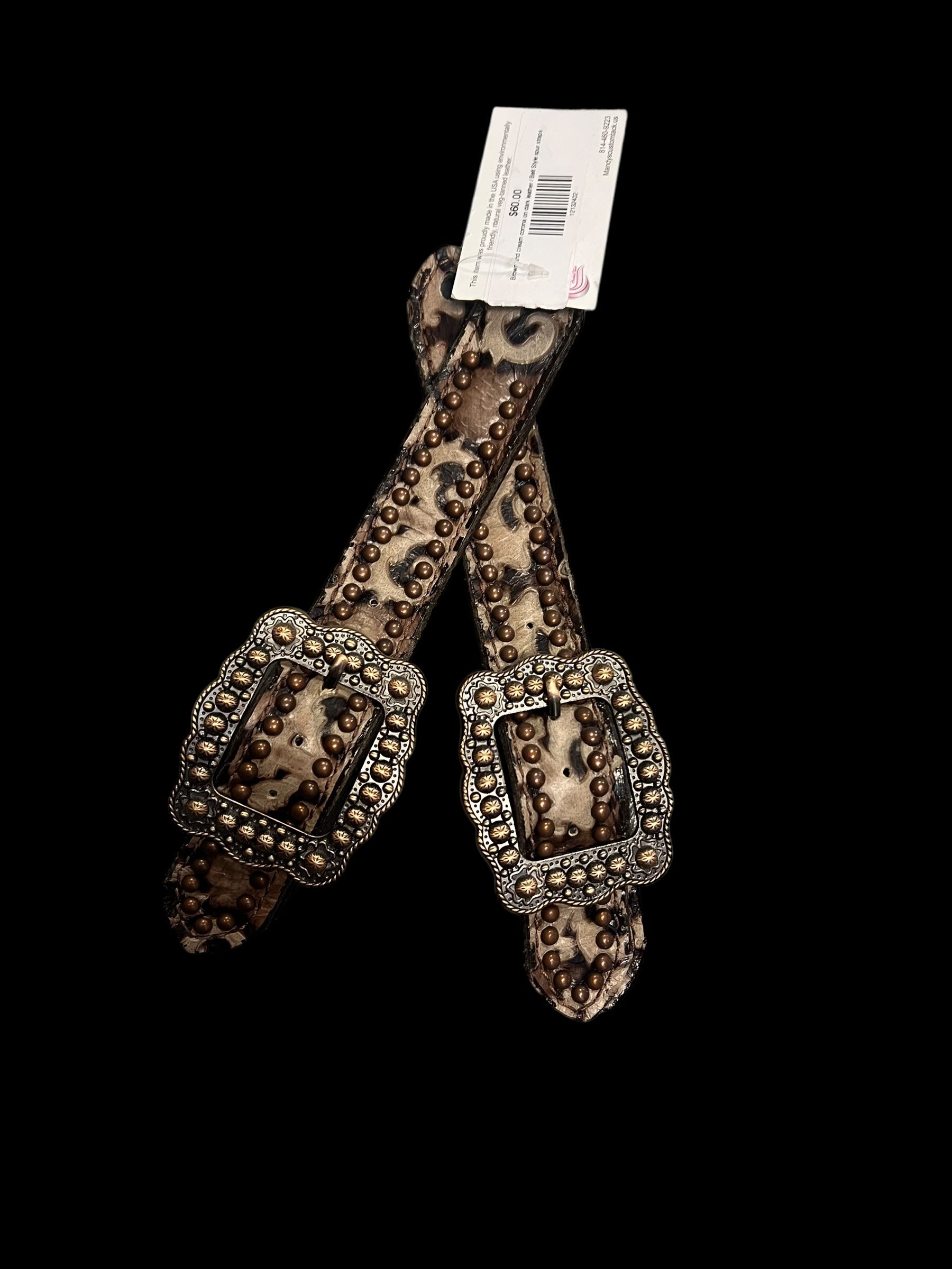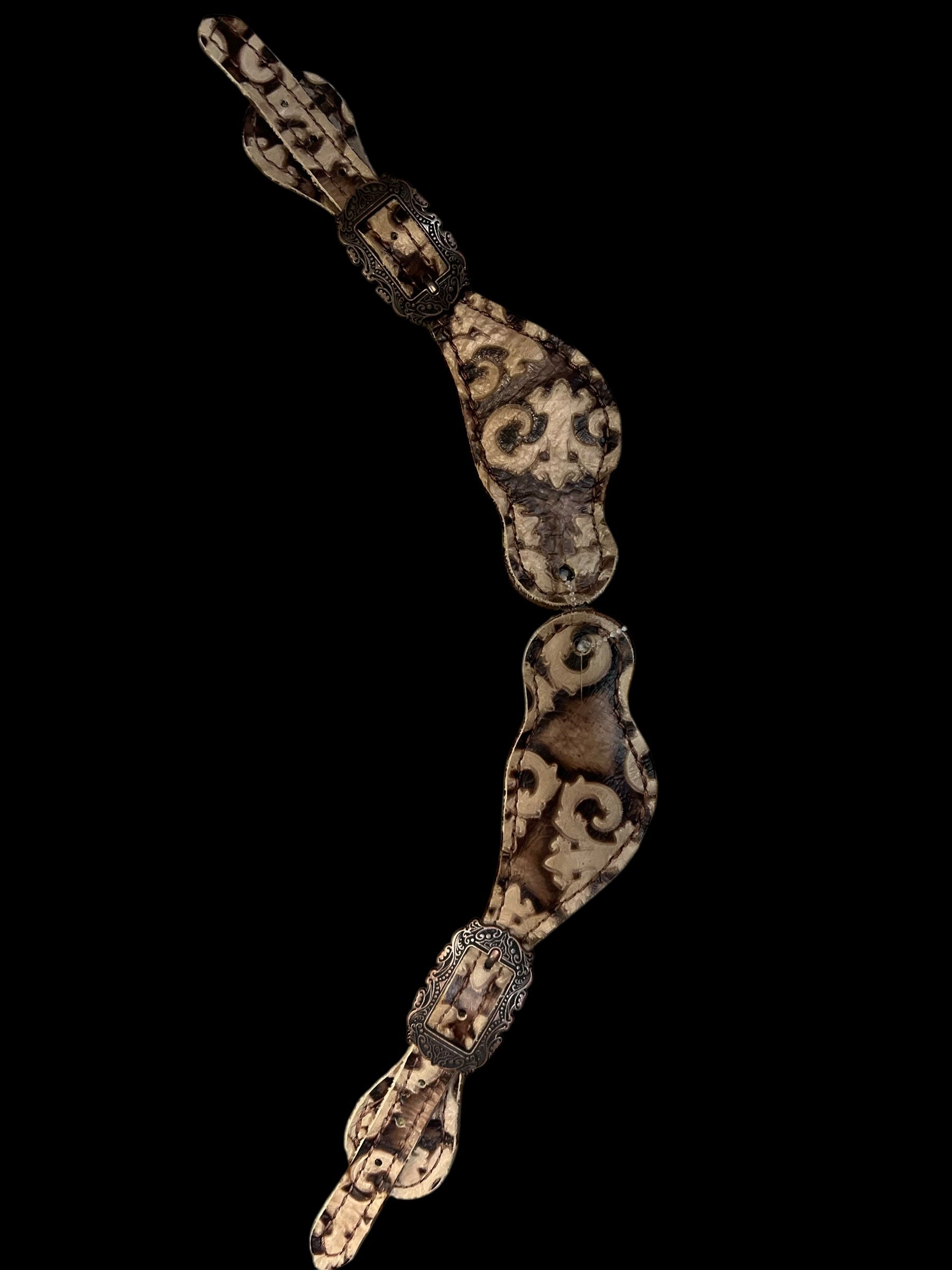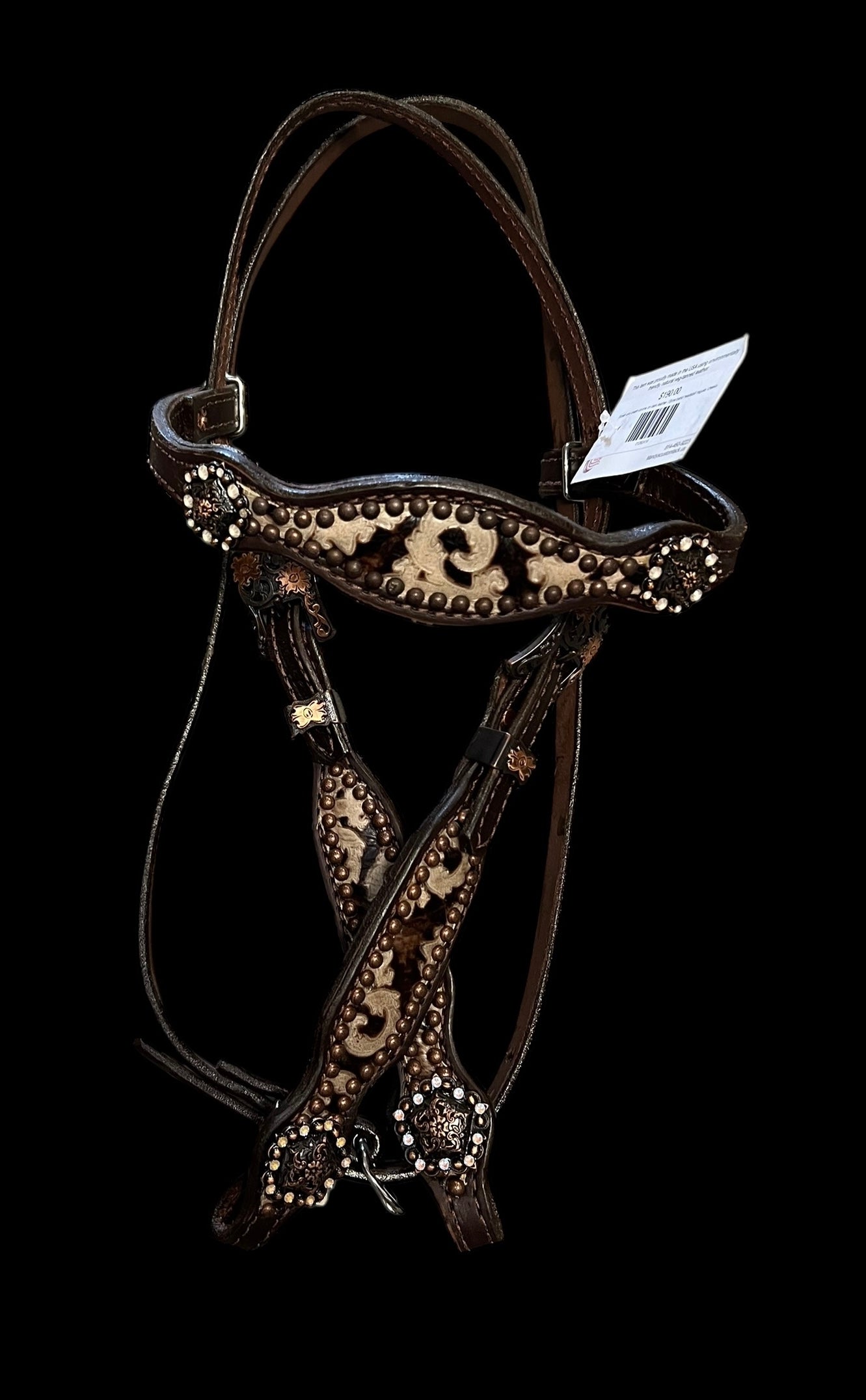 This ensemble features dark chocolate english bridle leather with brown and cream Corona embossed leather overlay, copper spots, and conchos with Swarovski rhinestones.