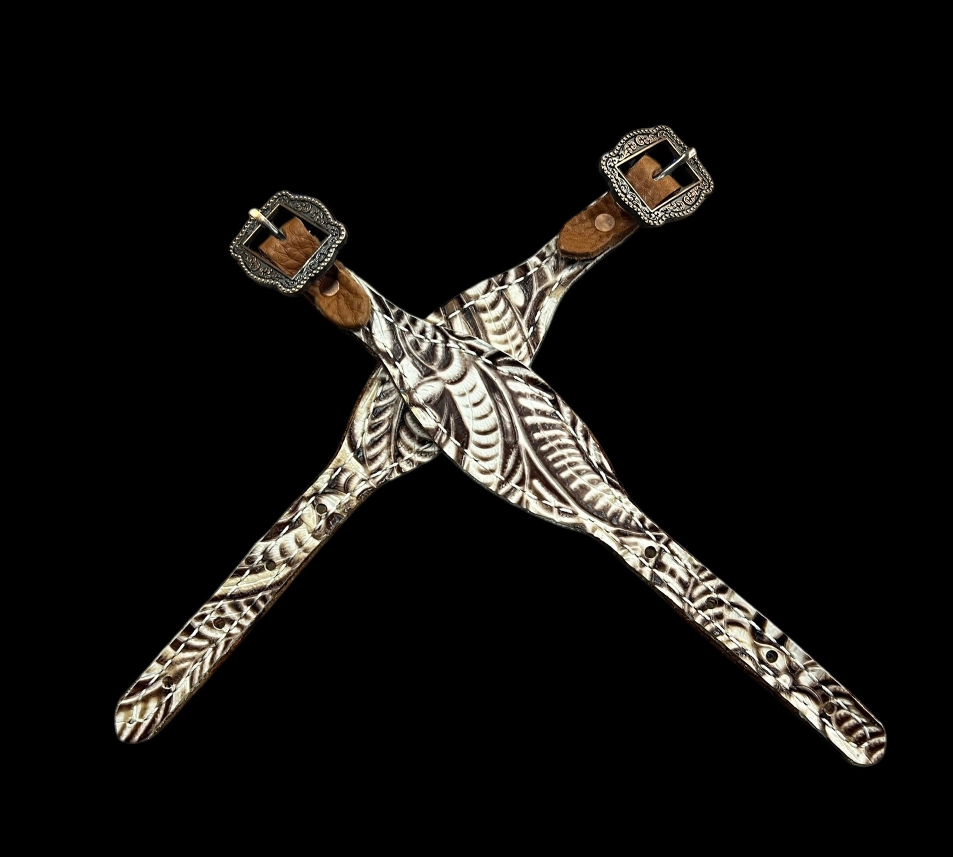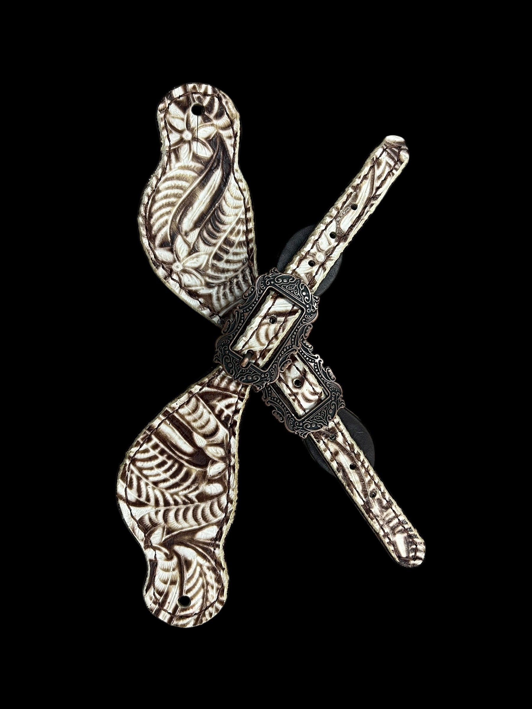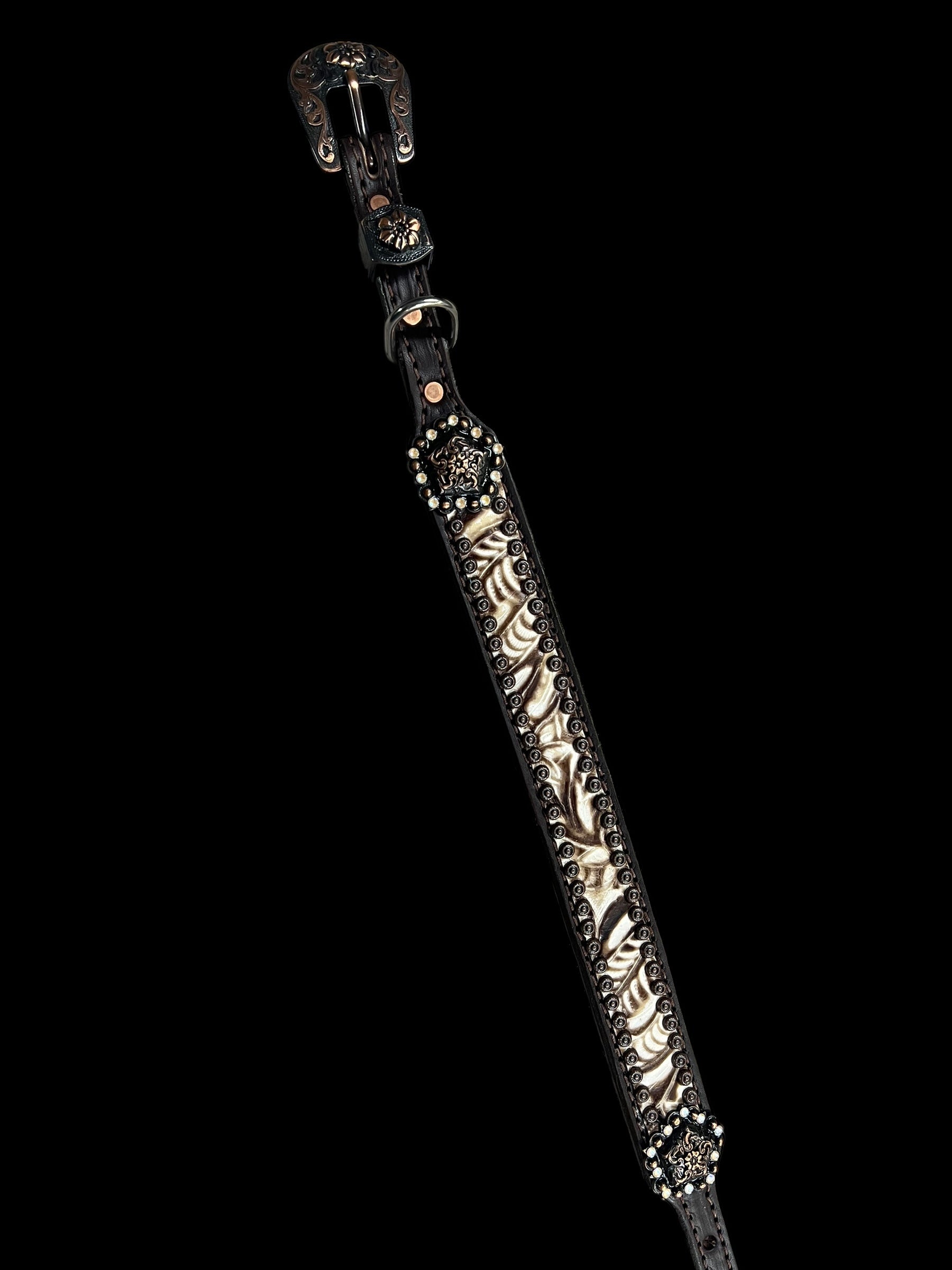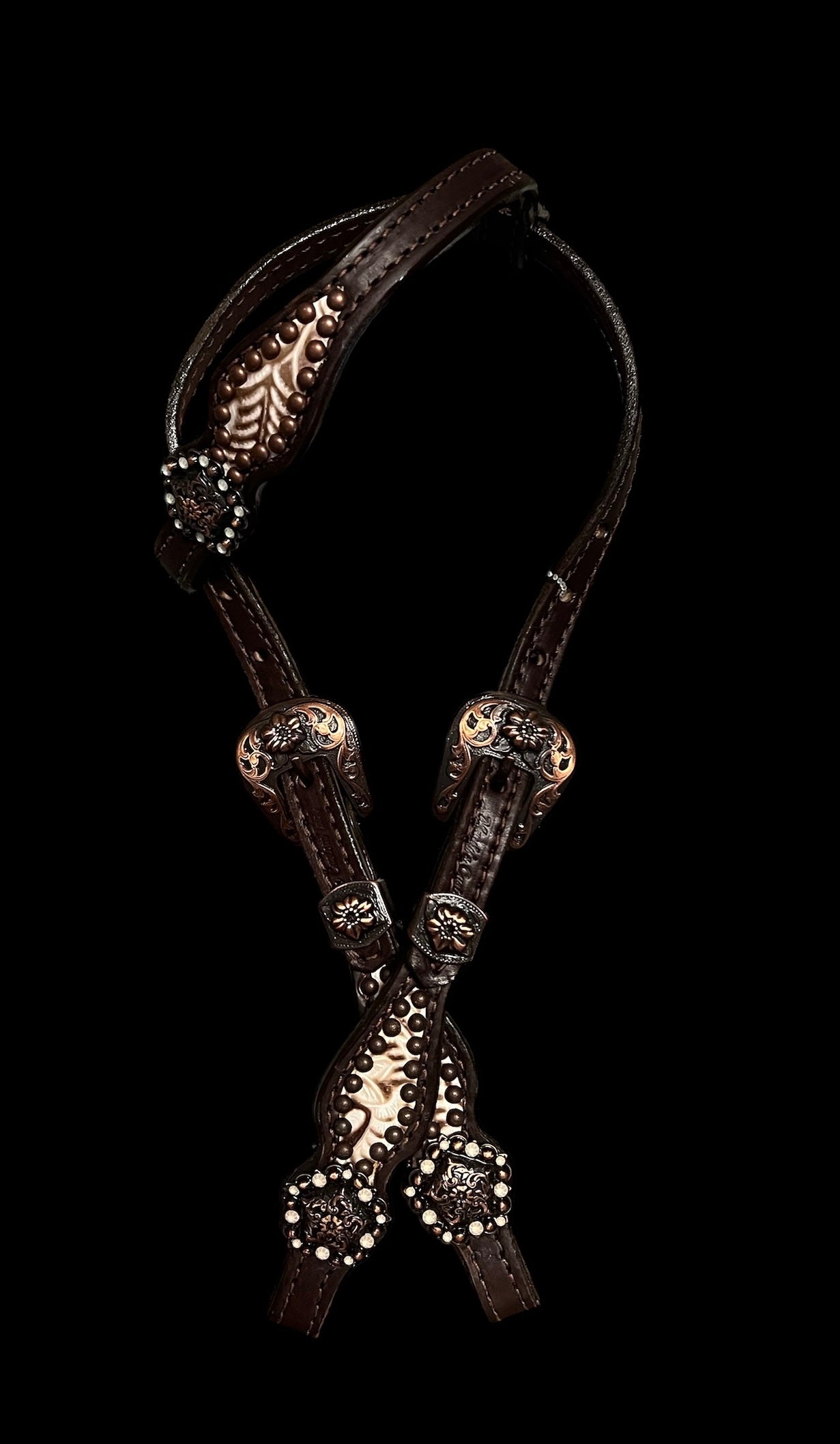 This ensemble features chocolate english bridle leather with brown and cream floral embossed leather overlay, copper spots, and conchos with genuine rhinestones.