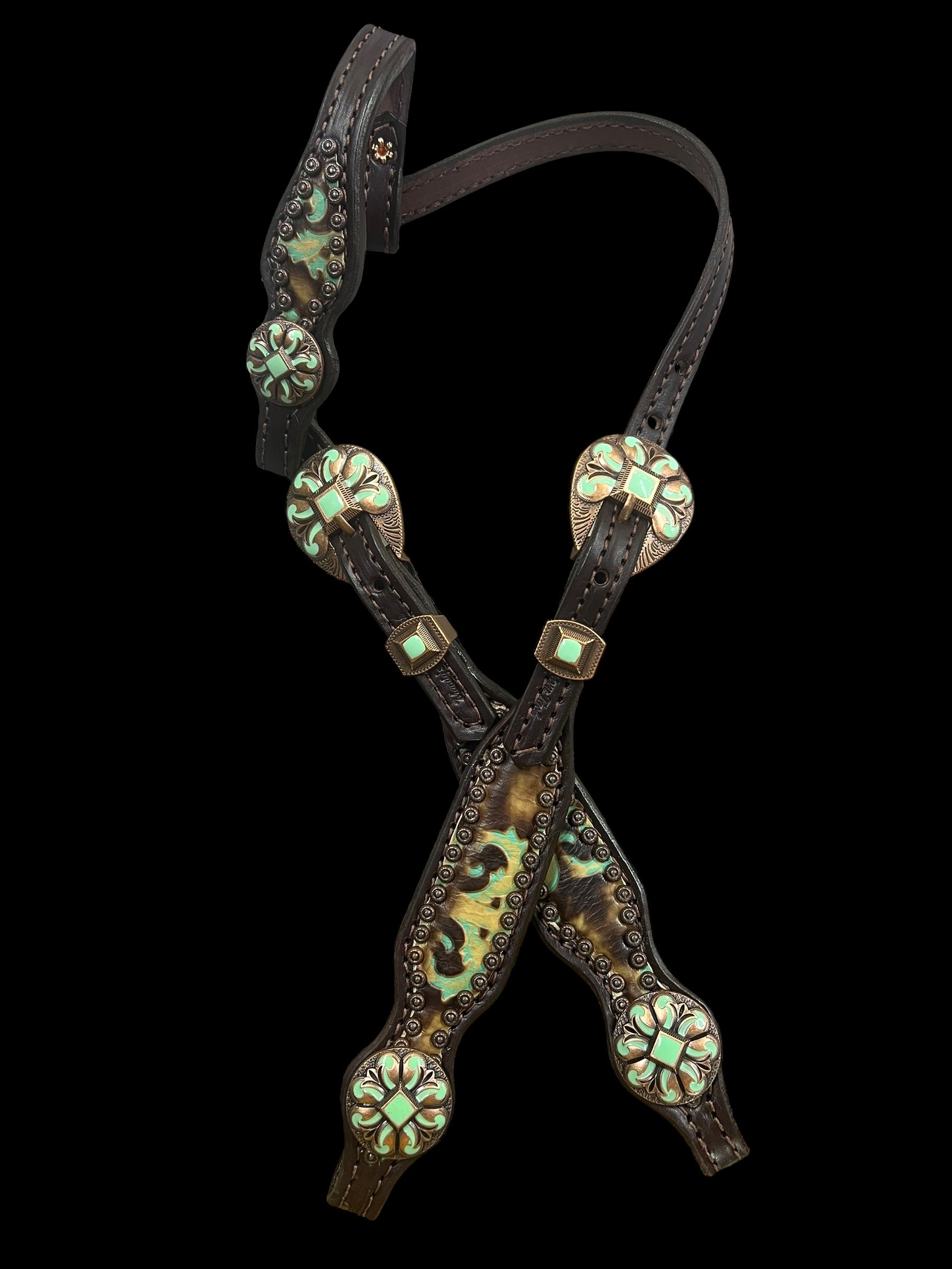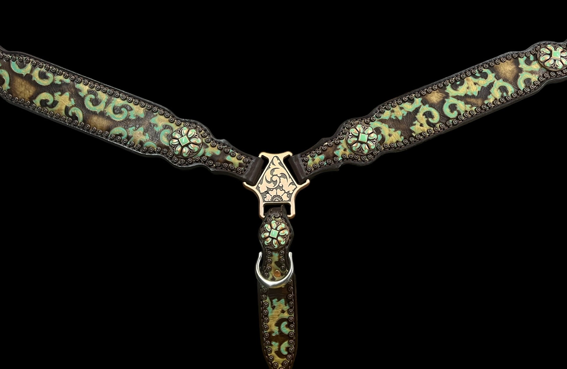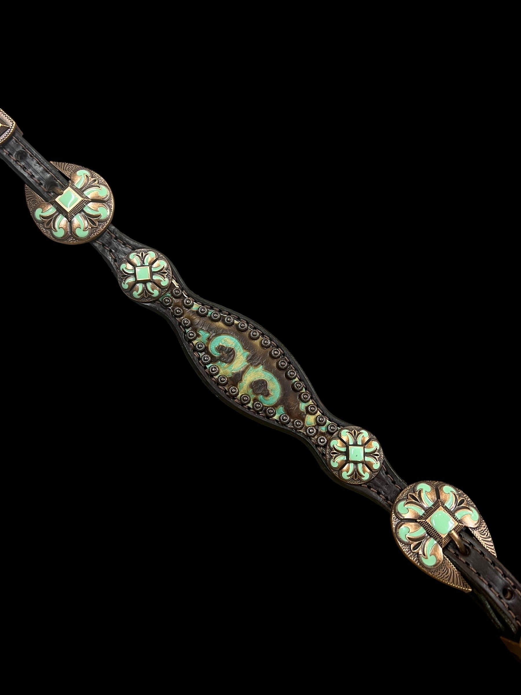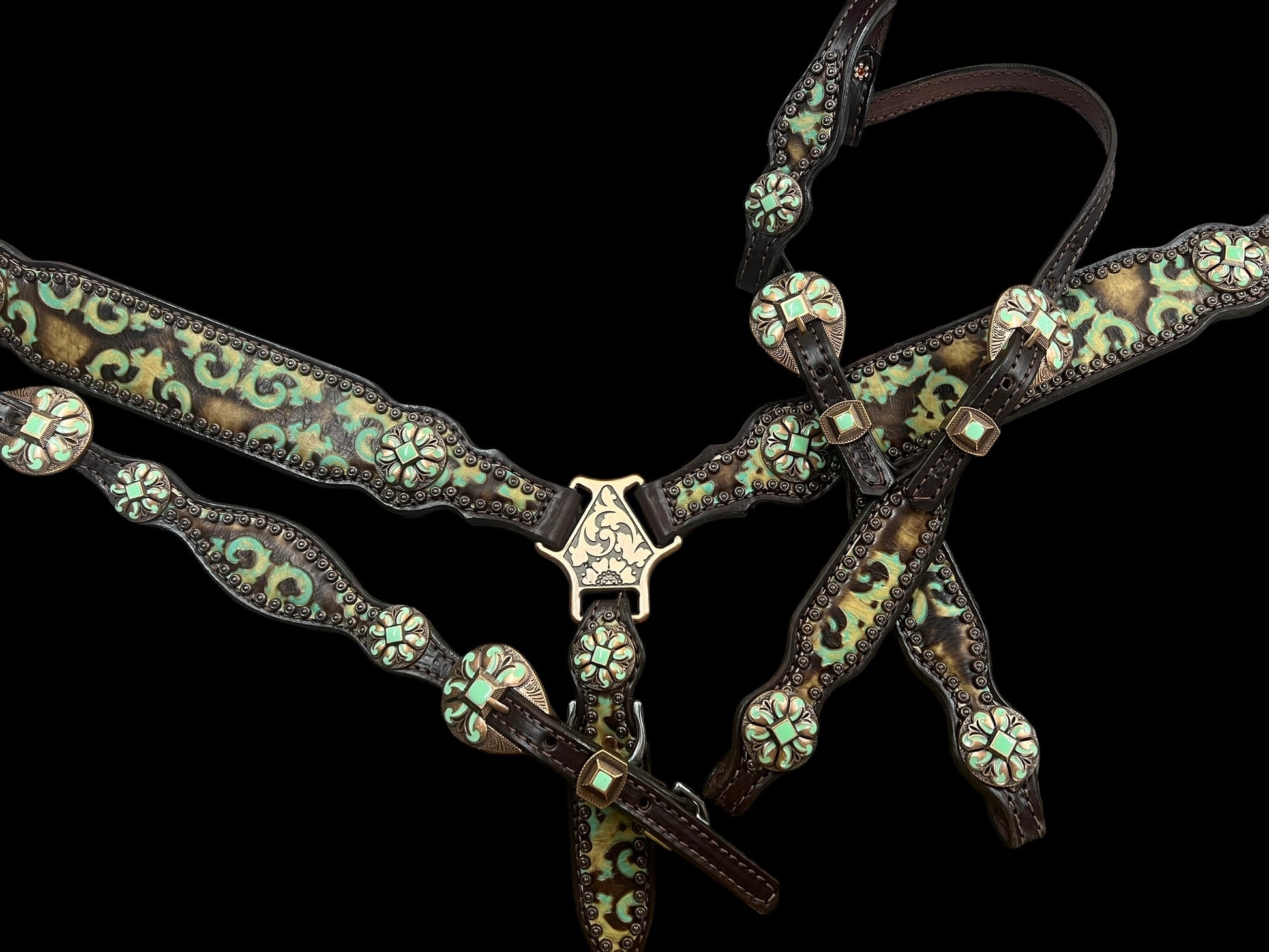 This ensemble features dark chocolate english bridle leather with brown and turquoise Corona embossed leather overlay, copper spots, and copper conchos.