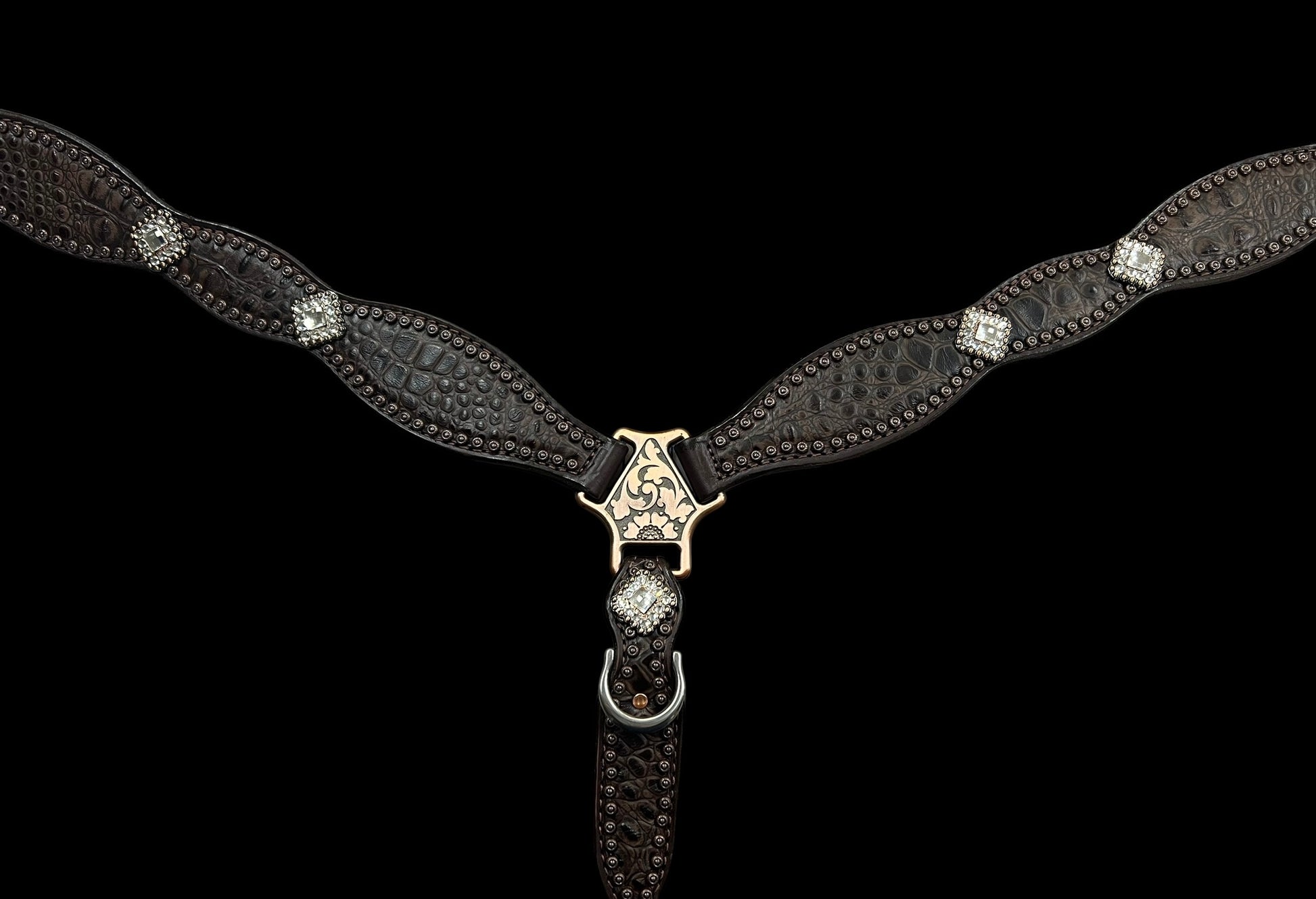 This one ear headstall and breast collar feature dark brown bridle leather, Cocoa gator embossed leather overlay, Copper spots and conchos with genuine rhinestones.