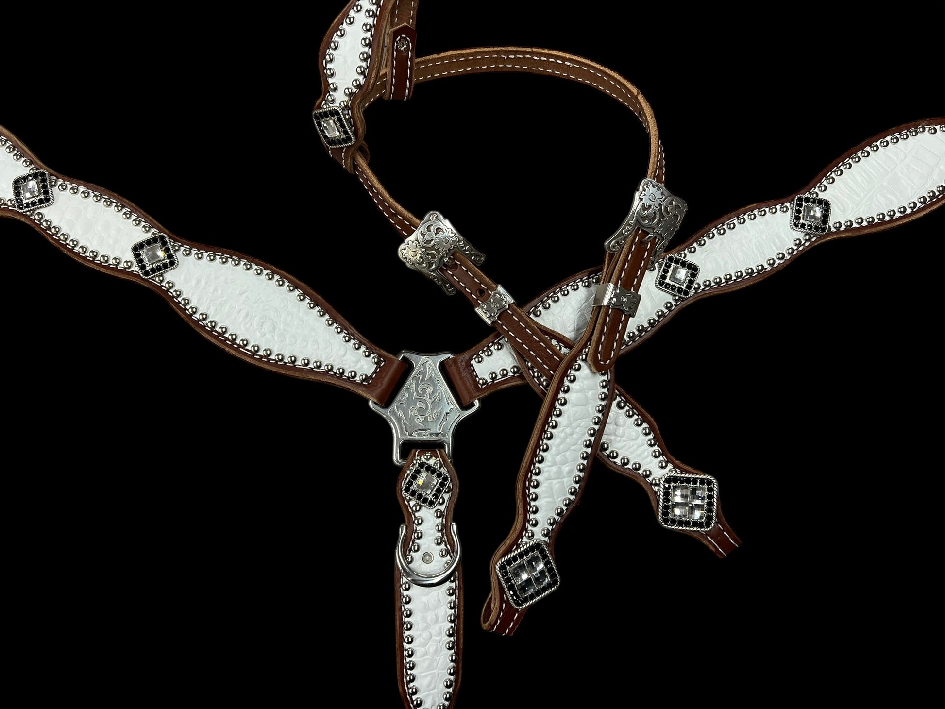 This ensembles features medium brown English bridle leather with white gator embossed leather overlay, stainless spots, and conchos with genuine rhinestones.