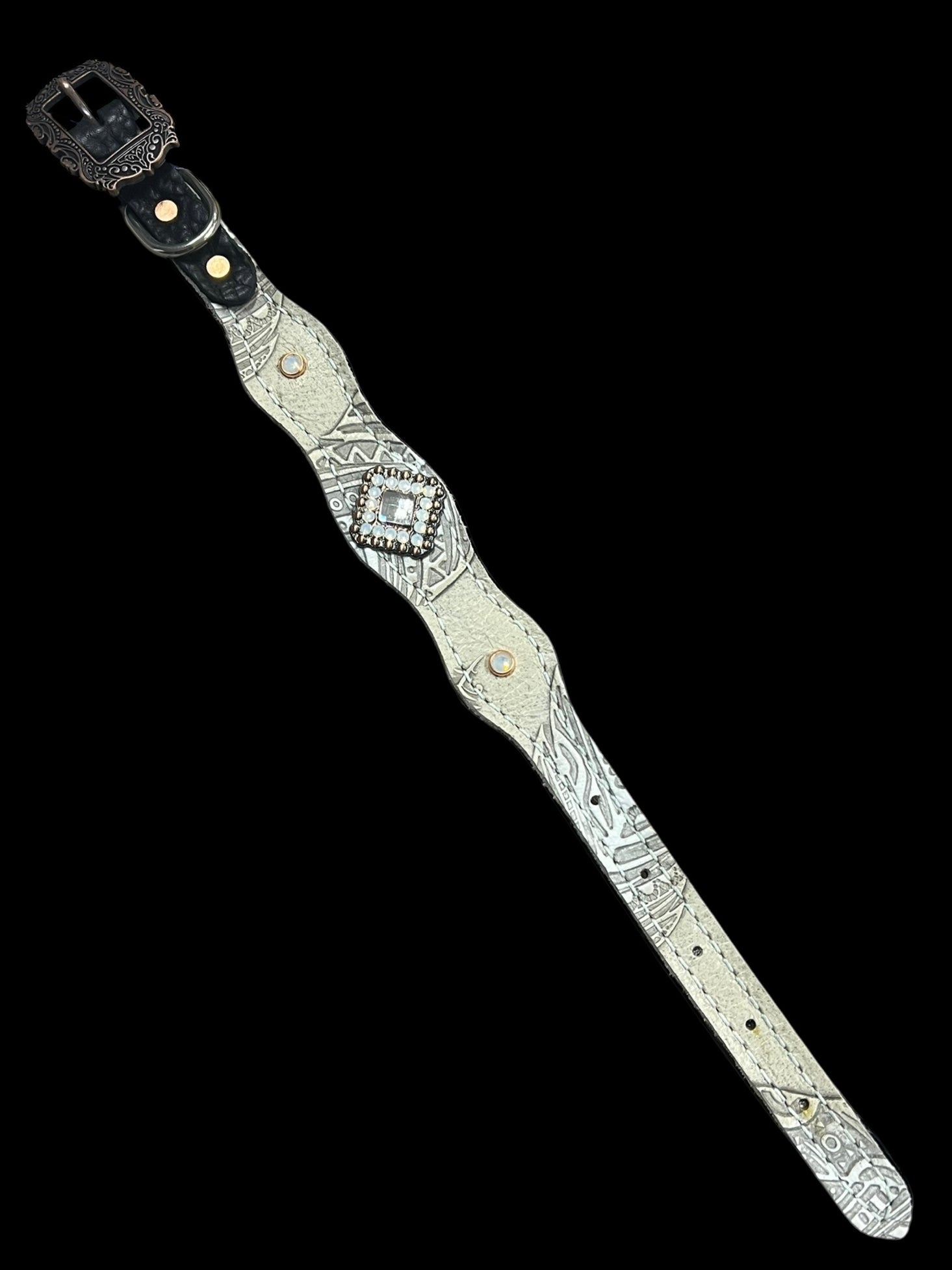 This ensemble features chocolate english bridle leather with cream feathers embossed leather overlay, copper spots, and conchos with genuine