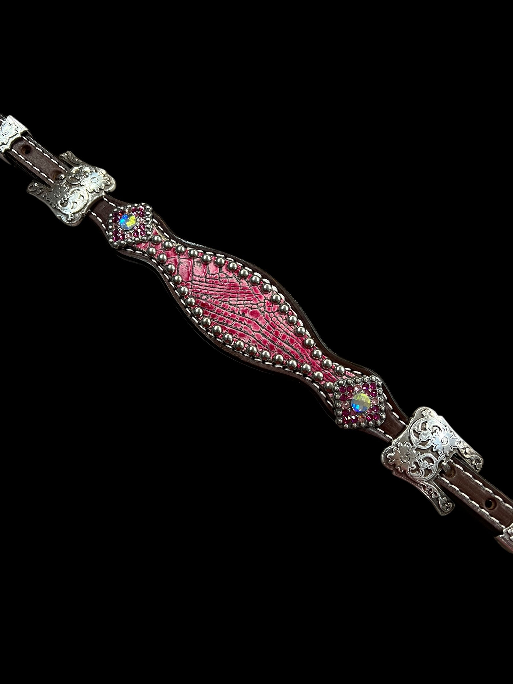 This ensemble features walnut brown english bridle leather with pink gator embossed leather overlay, stainless spots, and conchos with genuine rhinestones.