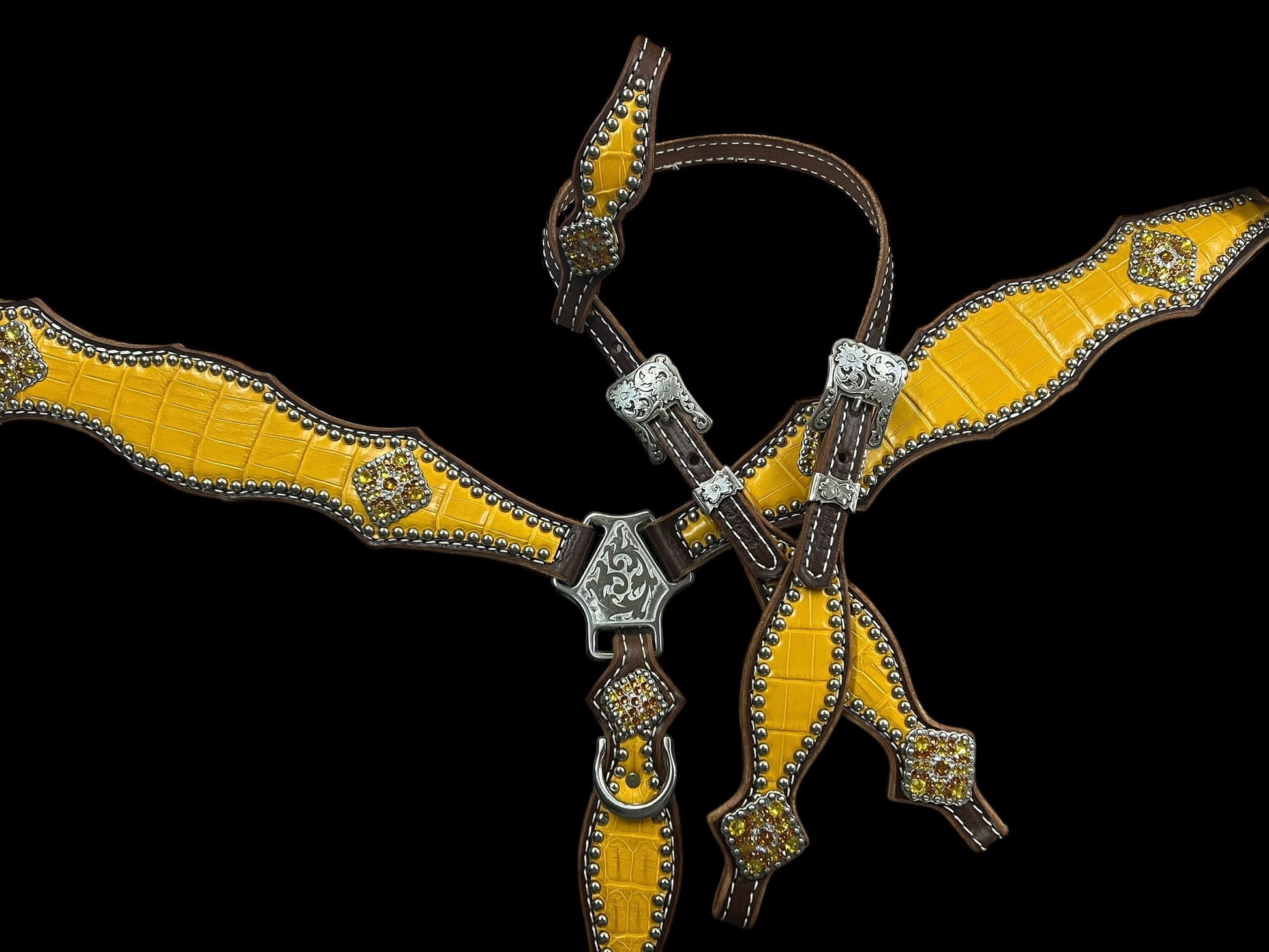This set features genuine alligator hide on walnut english bridle leather, stainless steel spots, and beautiful conchos with genuine rhinestones. Yellow is hard to find, and harder to find this beautiful!
