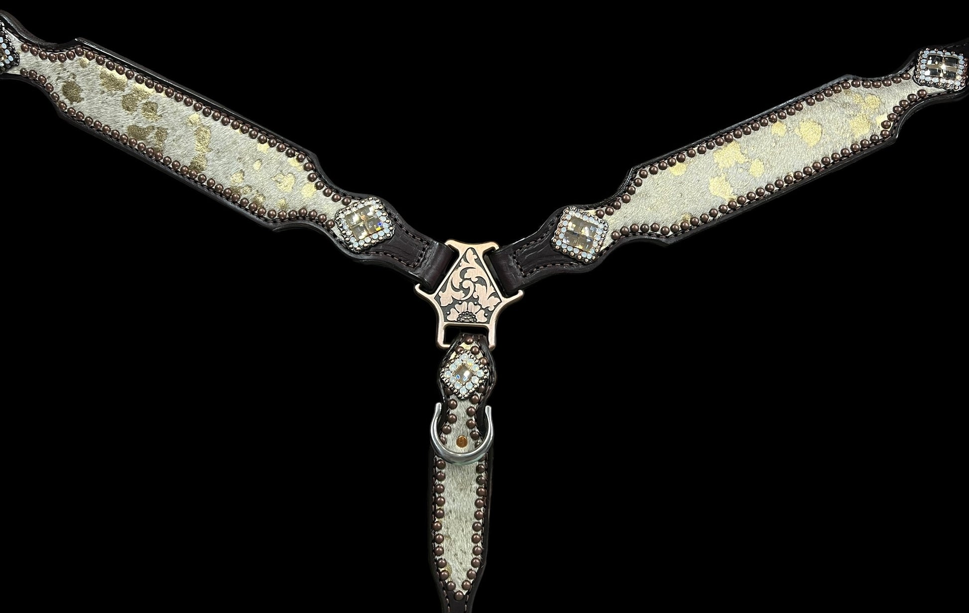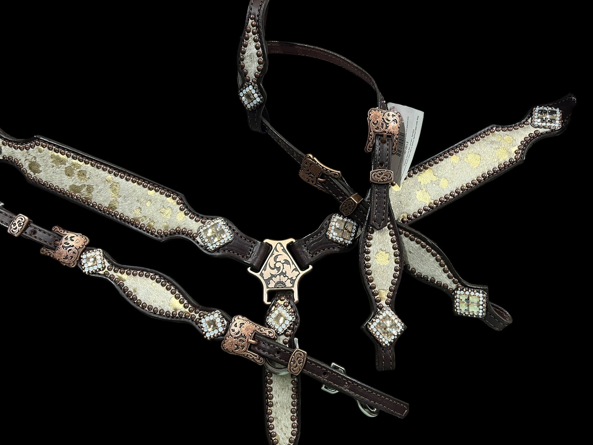 This ensemble features chocolate english bridle leather with white with gold acid wash hair on hide leather overlay, copper spots, and conchos with genuine rhinestones.