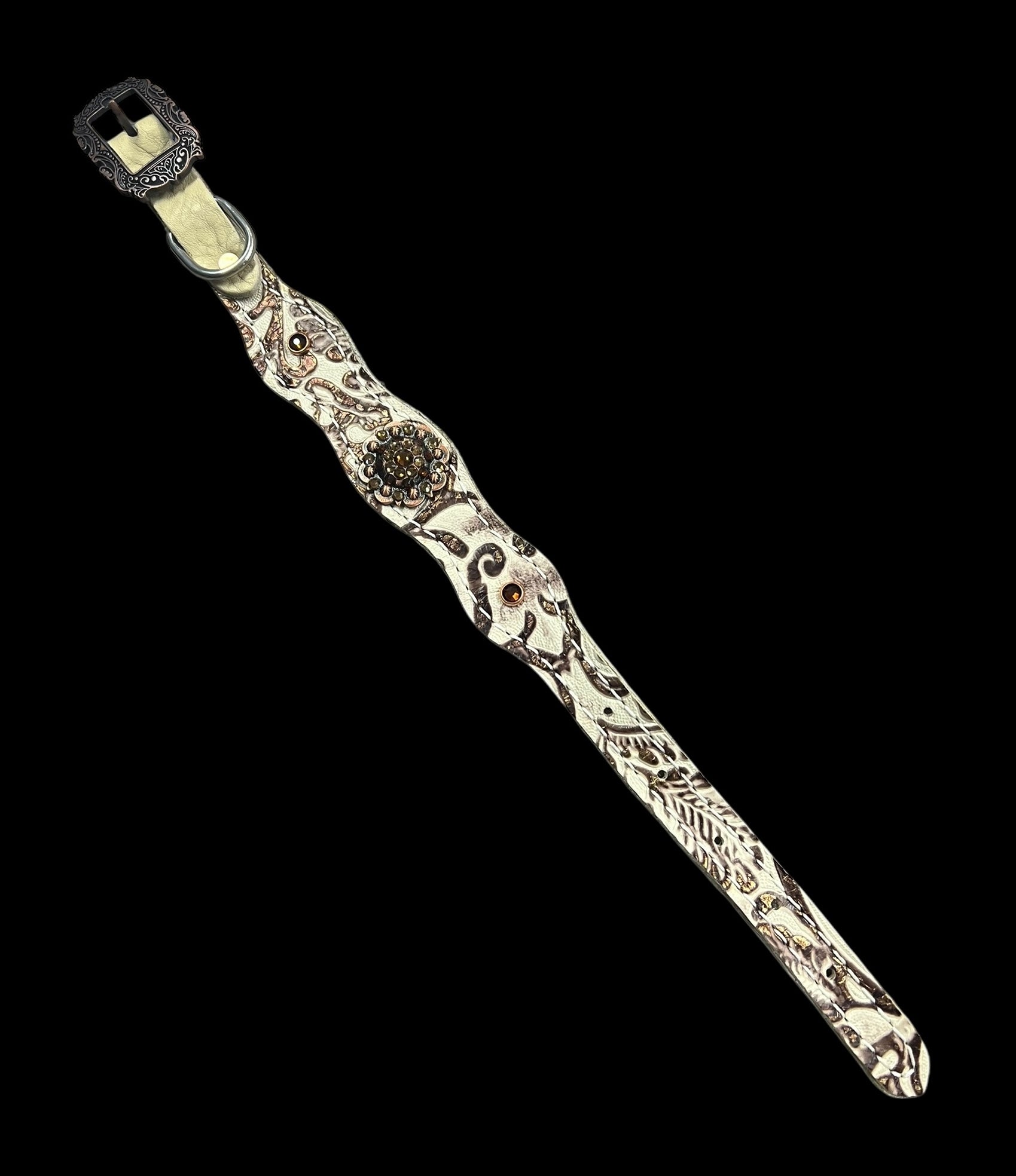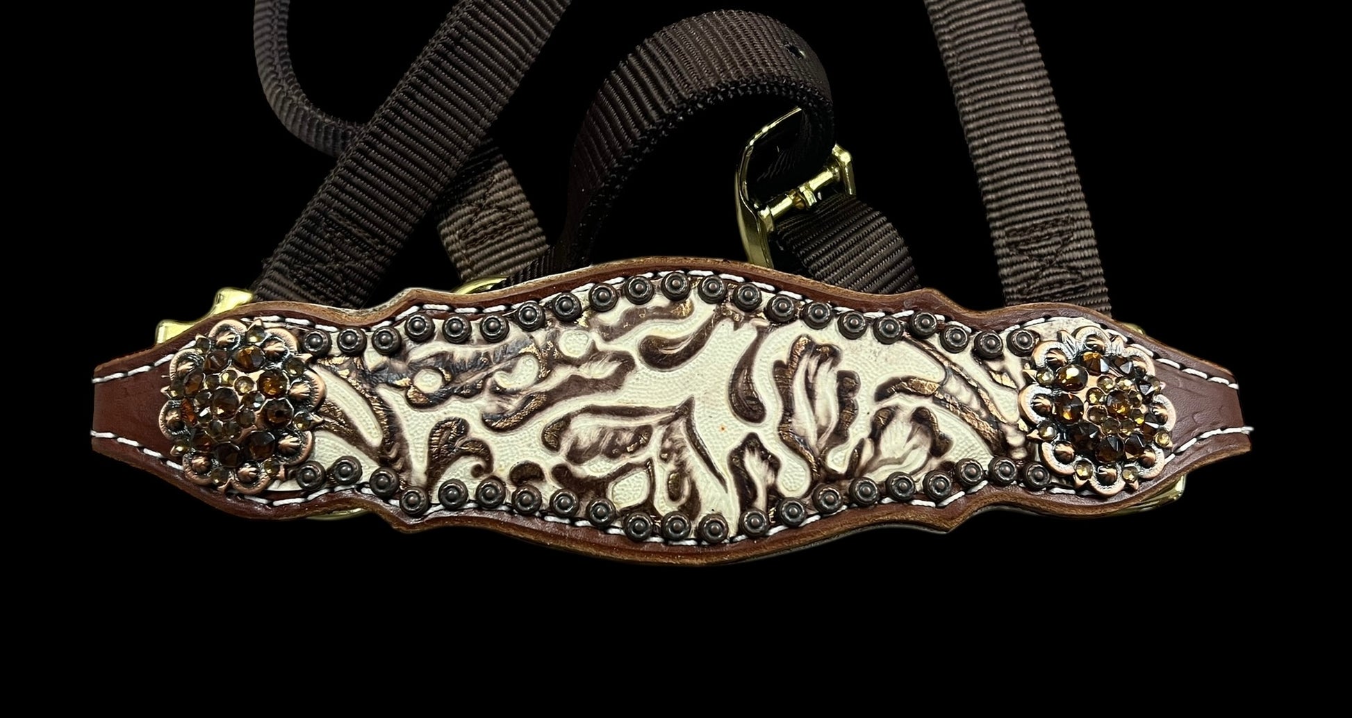 This ensemble features Medium english bridle leather with brown and cream floral embossed leather overlay, copper spots, and conchos with Swarovski rhinestones