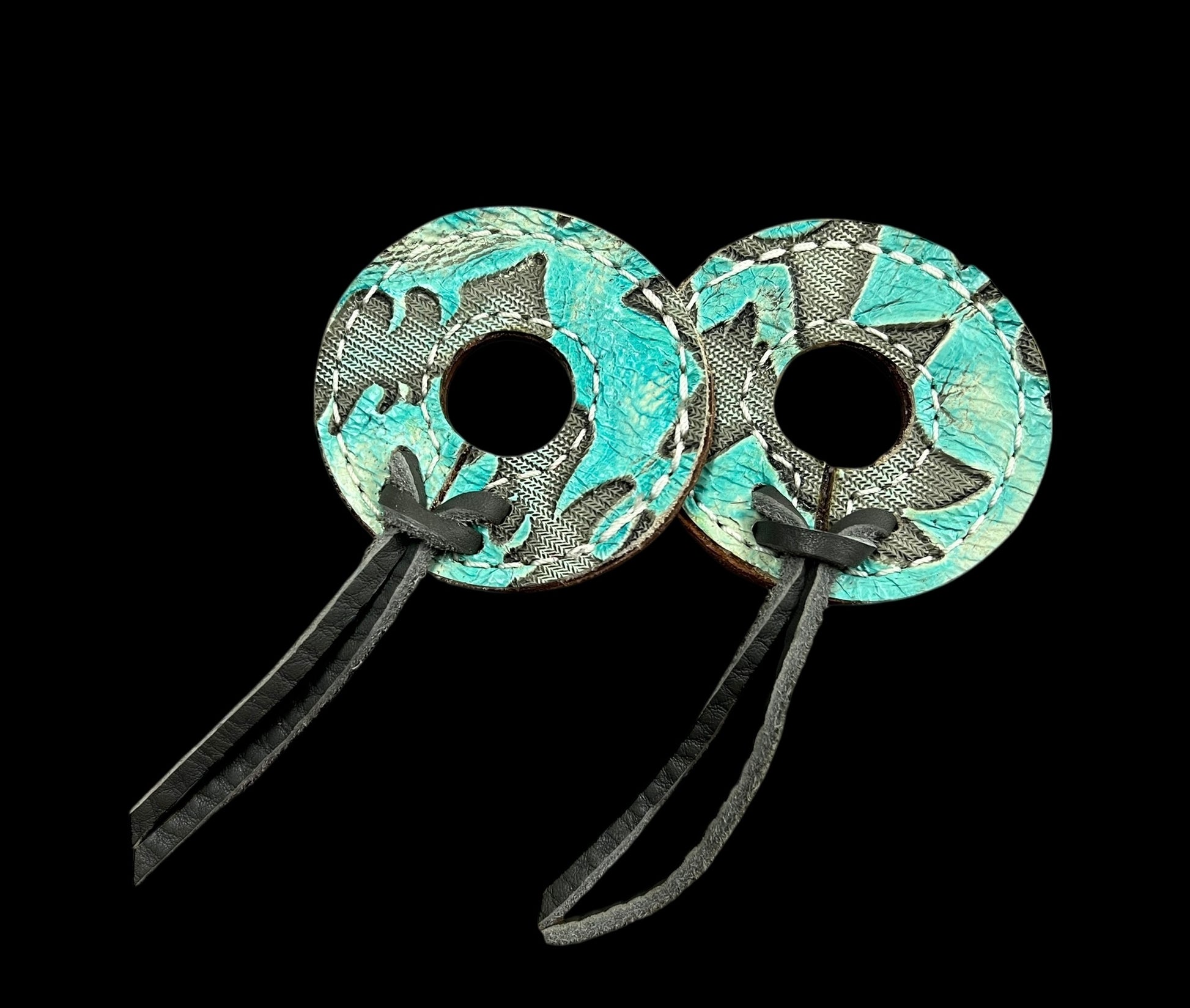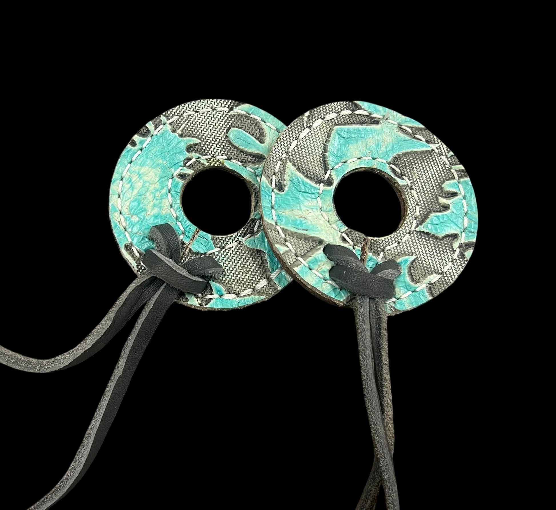 This ensemble features chocolate english bridle leather with  turquoise Laredo embossed leather overlay, copper spots, and handmade conchos