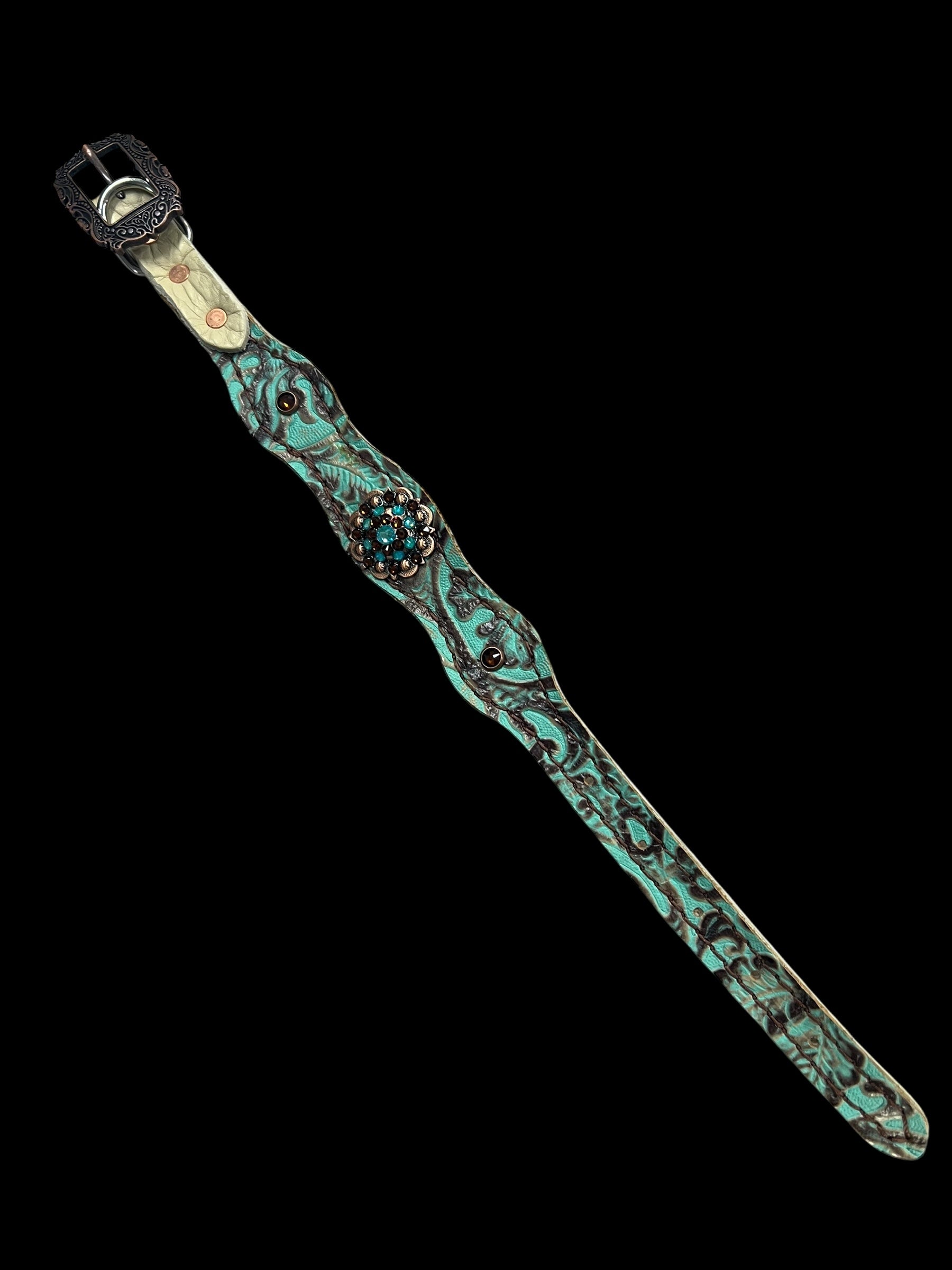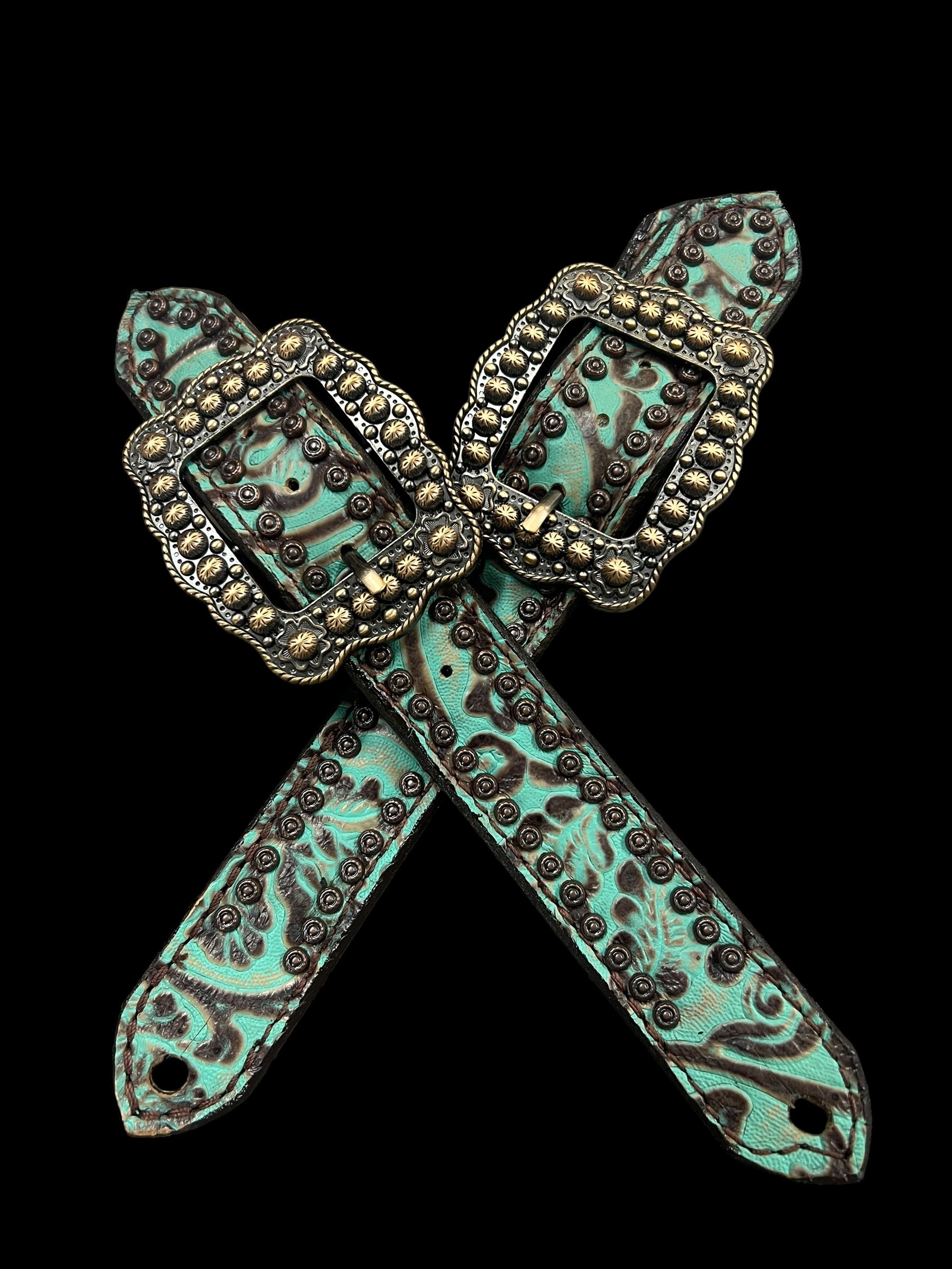 This ensemble features dark chocolate english bridle leather with mint and brown floral embossed leather overlay, copper spots, and conchos with genuine rhinestones.