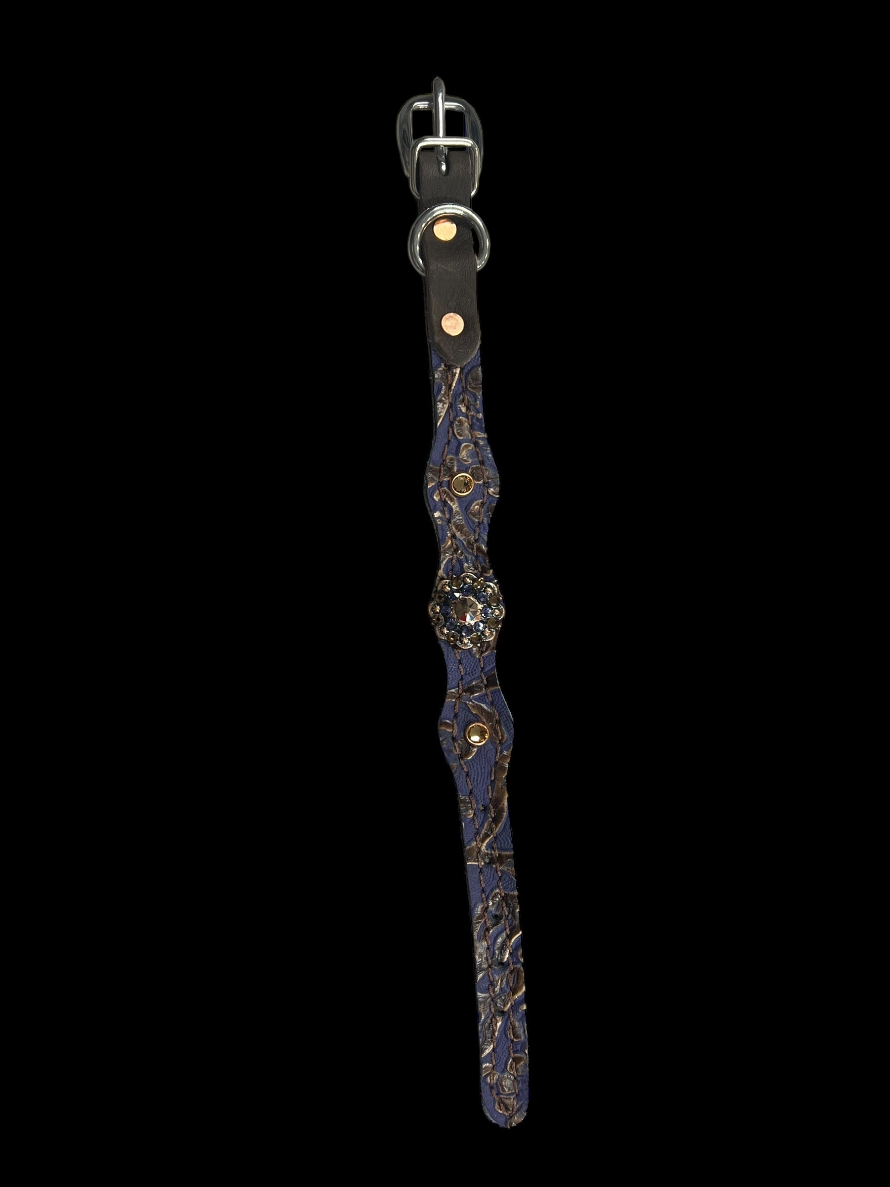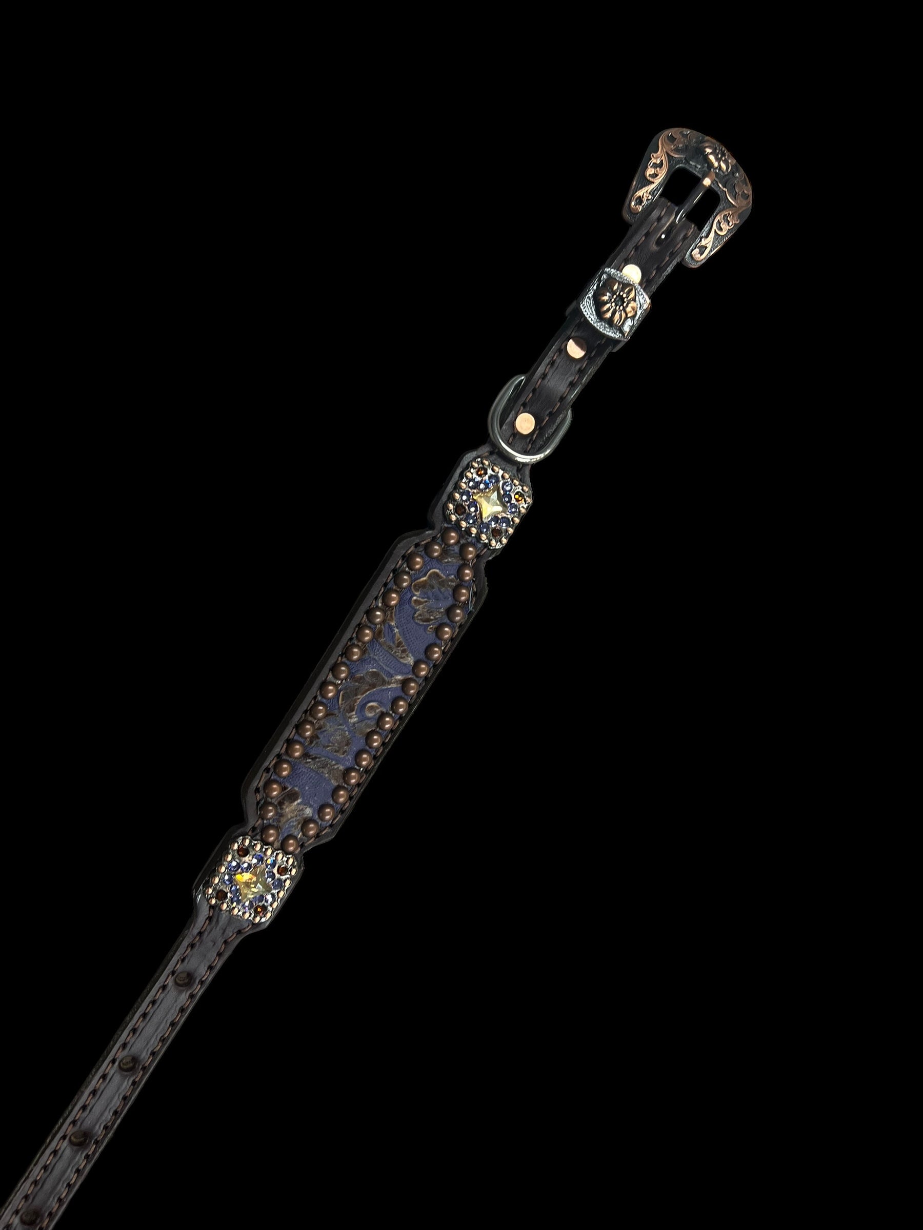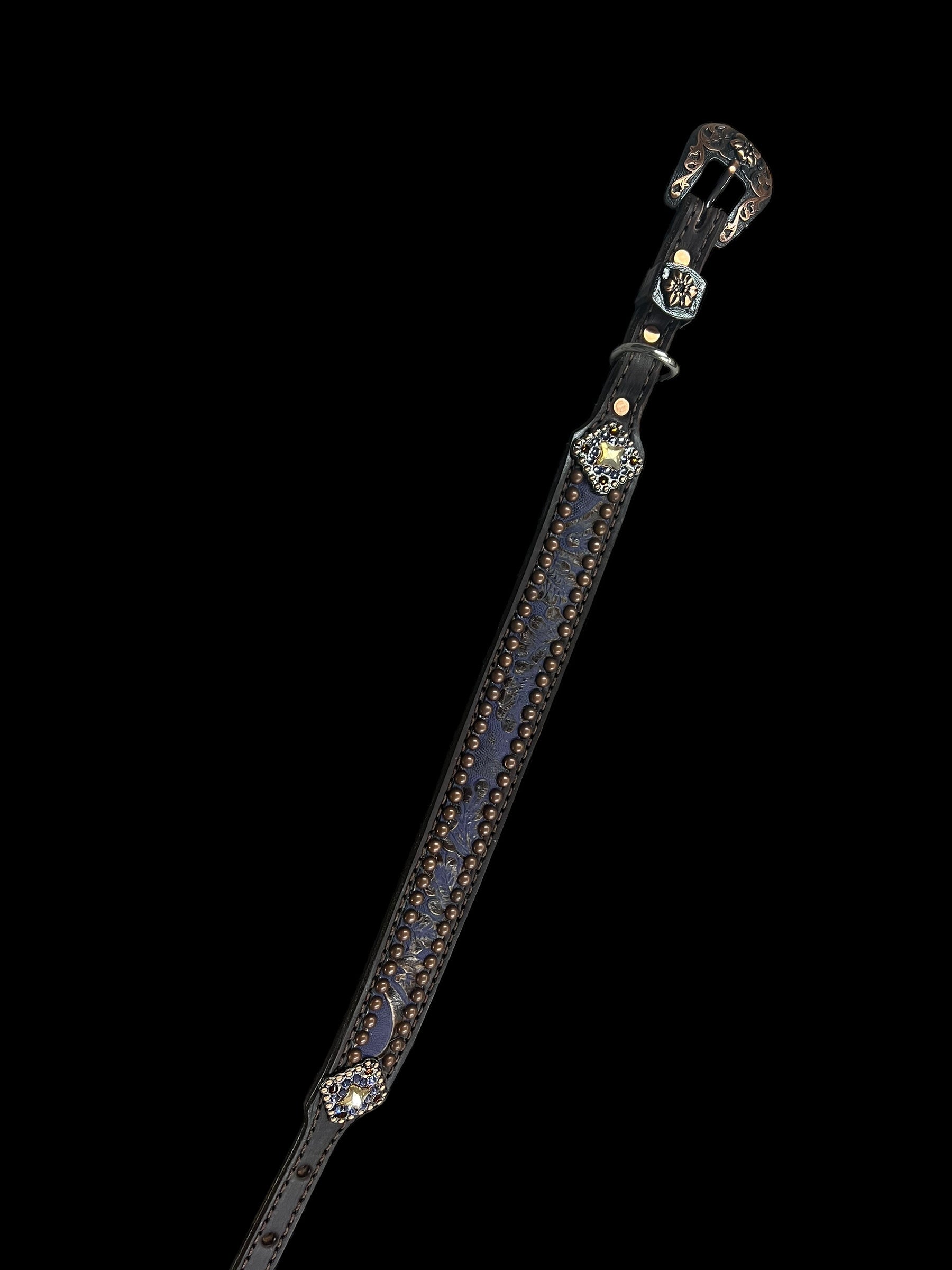 This ensemble features chocolate english bridle leather with purple and brown cowboy floral embossed overlay, copper spots, and conchos with genuine rhinestones.