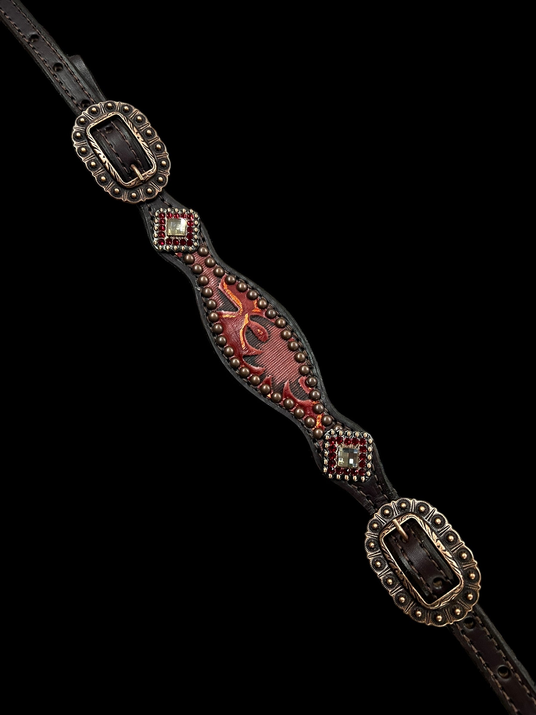 This ensemble features chocolate english bridle leather with red and copper Laredo embossed leather overlay, copper spots, and conchos with genuine rhinestones