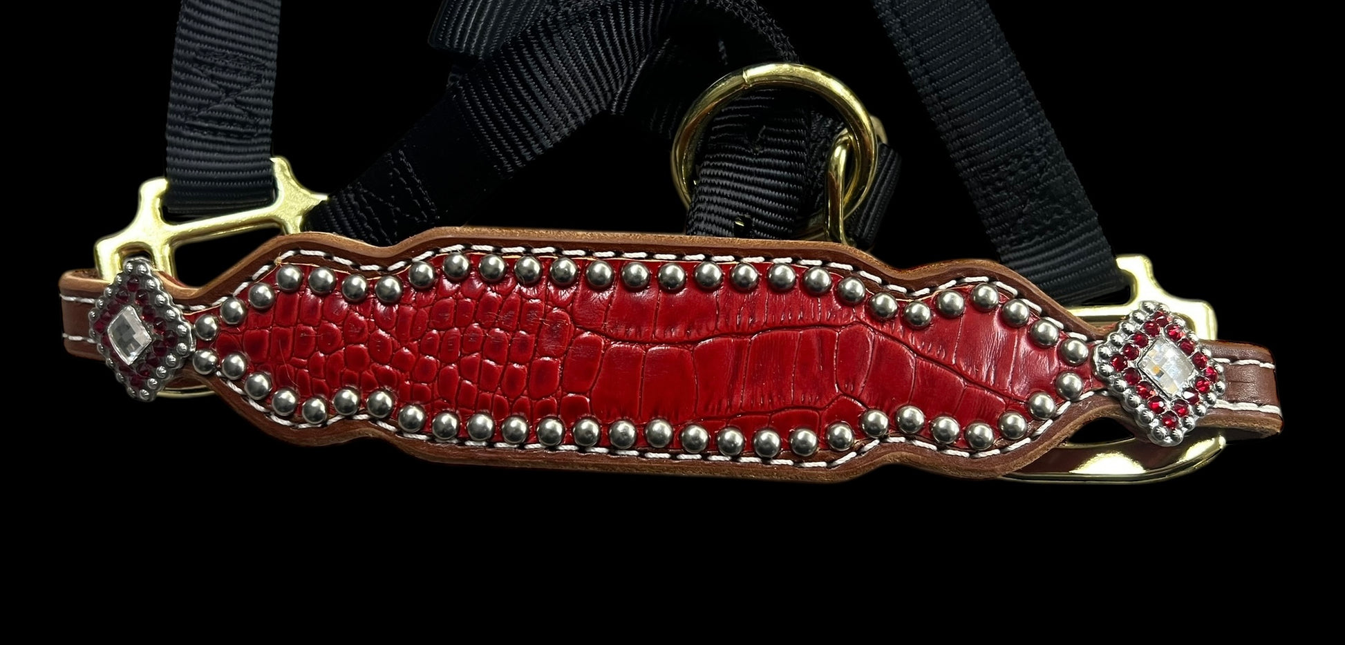 This ensemble features medium english bridle leather with red gator embossed leather overlay, stainless spots, and conchos with Swarovski rhinestones