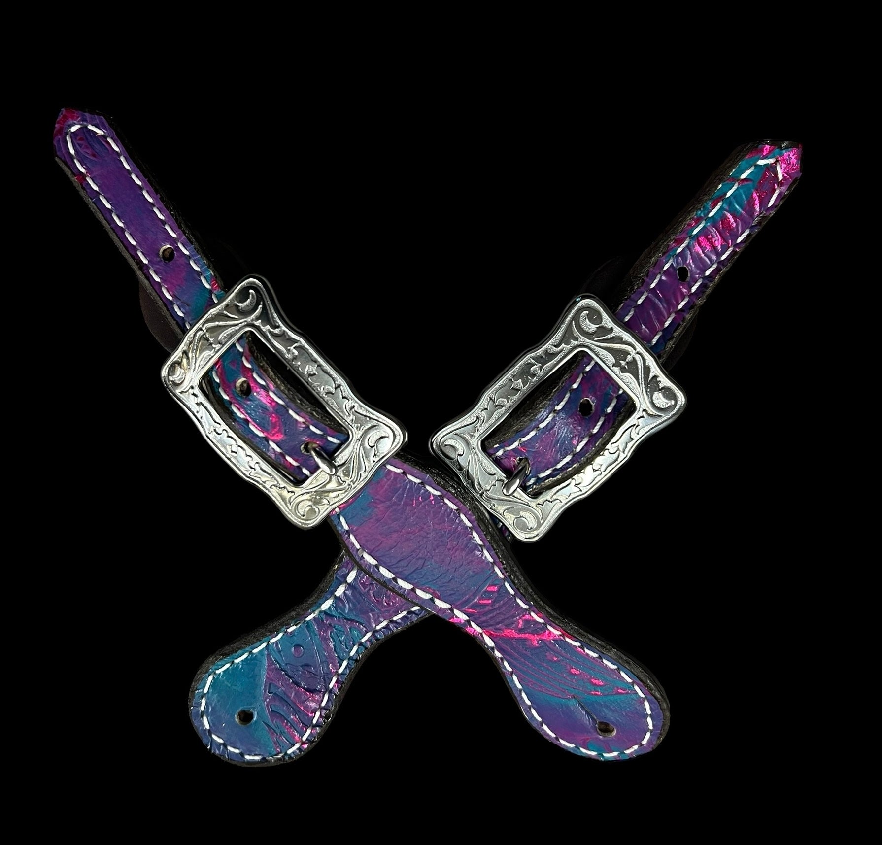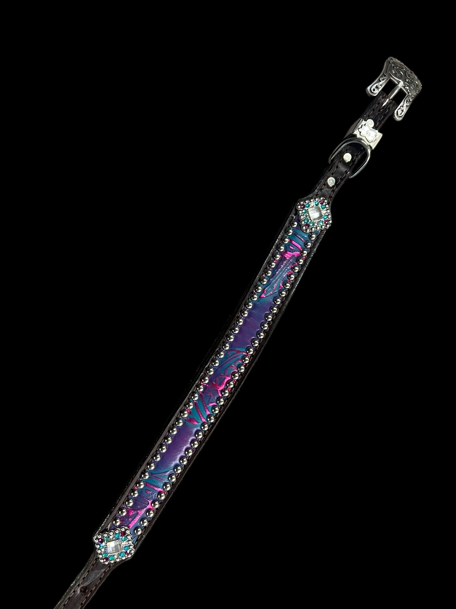This ensemble features chocolate english bridle leather with 80s inspired feather embossed leather overlay, stainess spots, and conchos with genuine rhinestones.