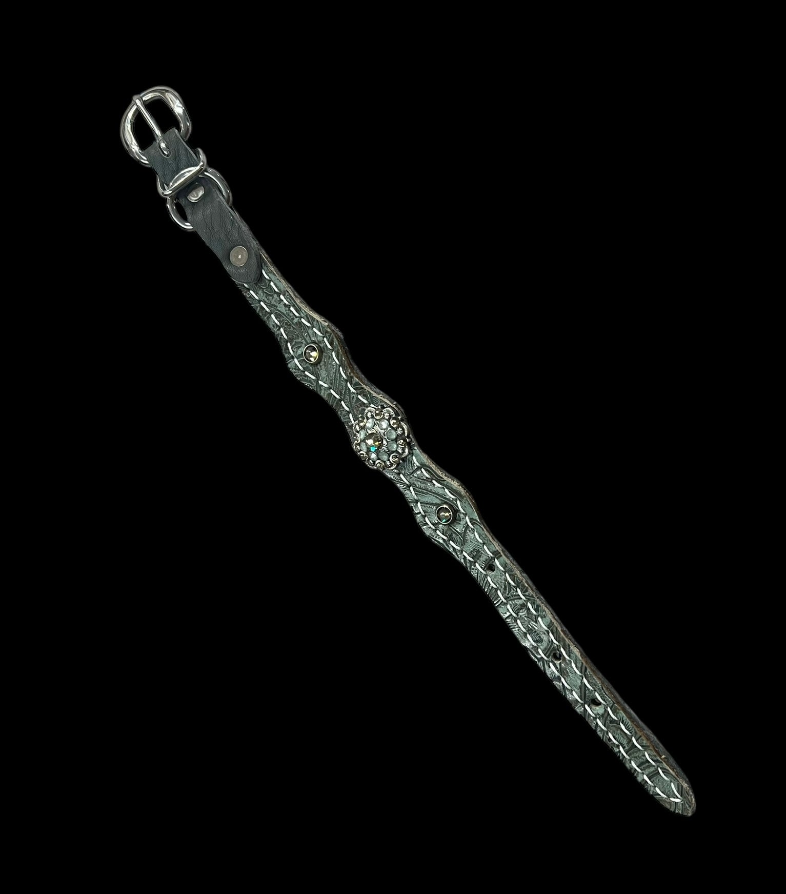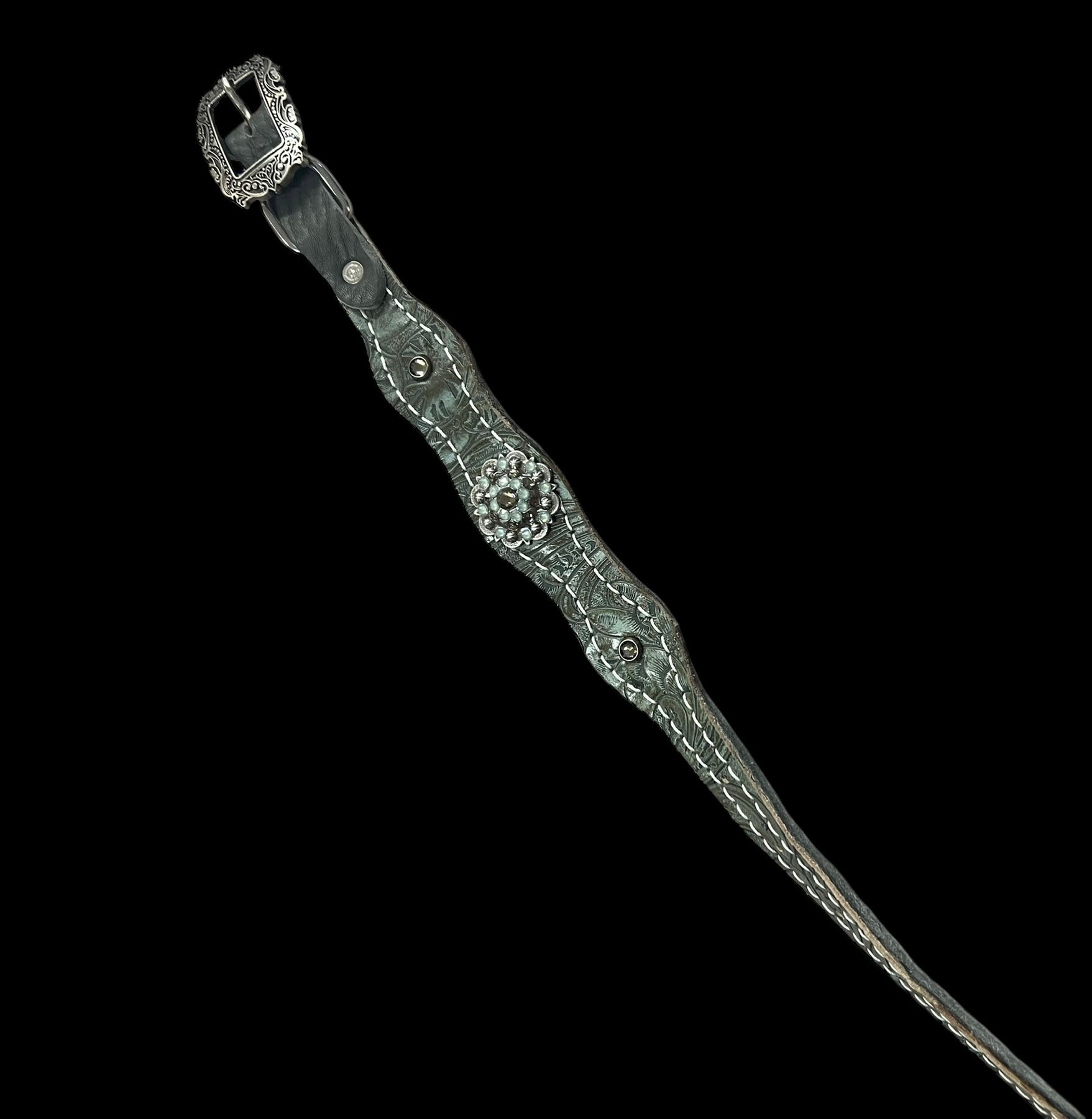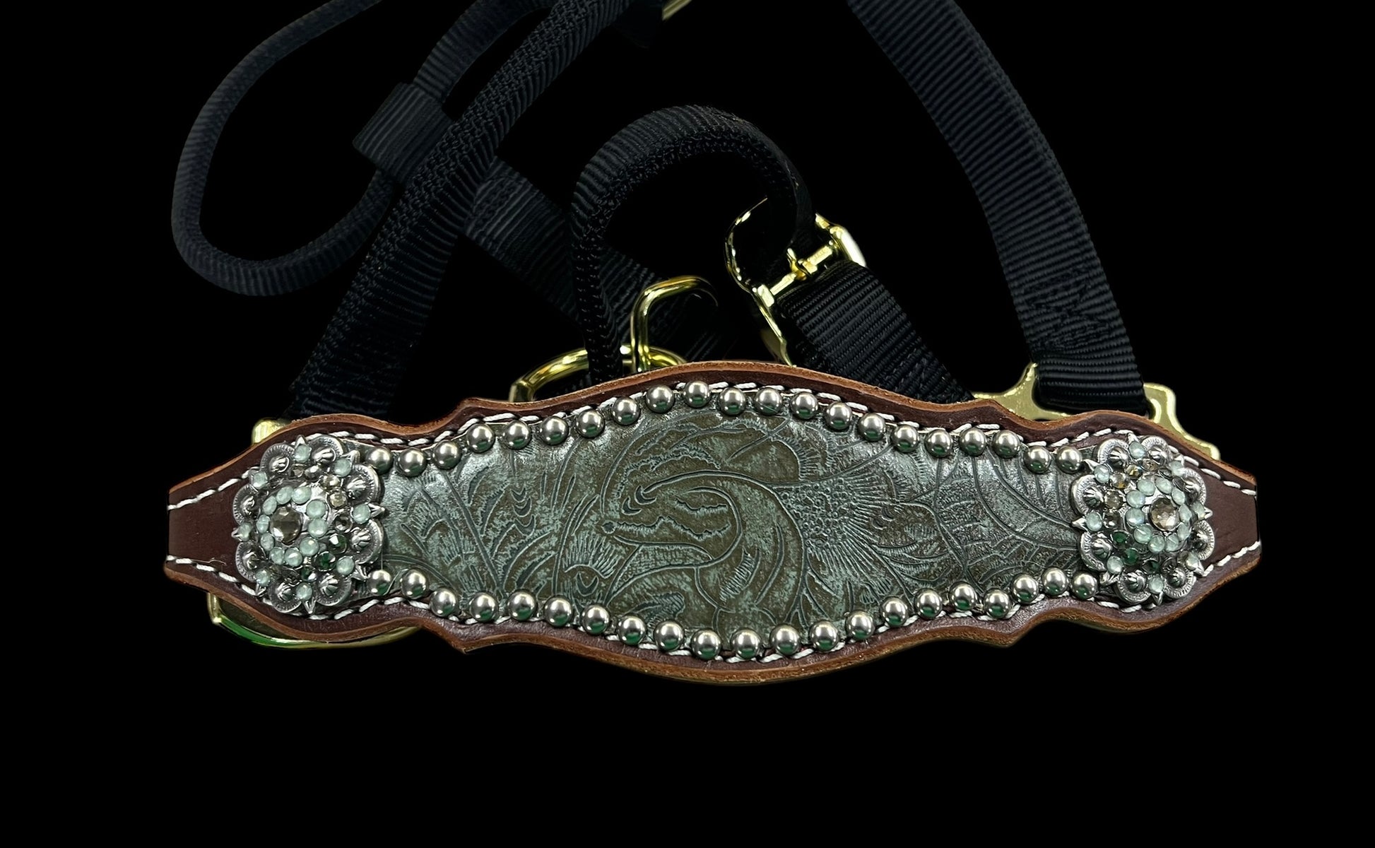 This ensemble features walnut english bridle leather with sage/grey dallas floral embossed leather overlay, stainless spots, and conchos with genuine rhinestones.