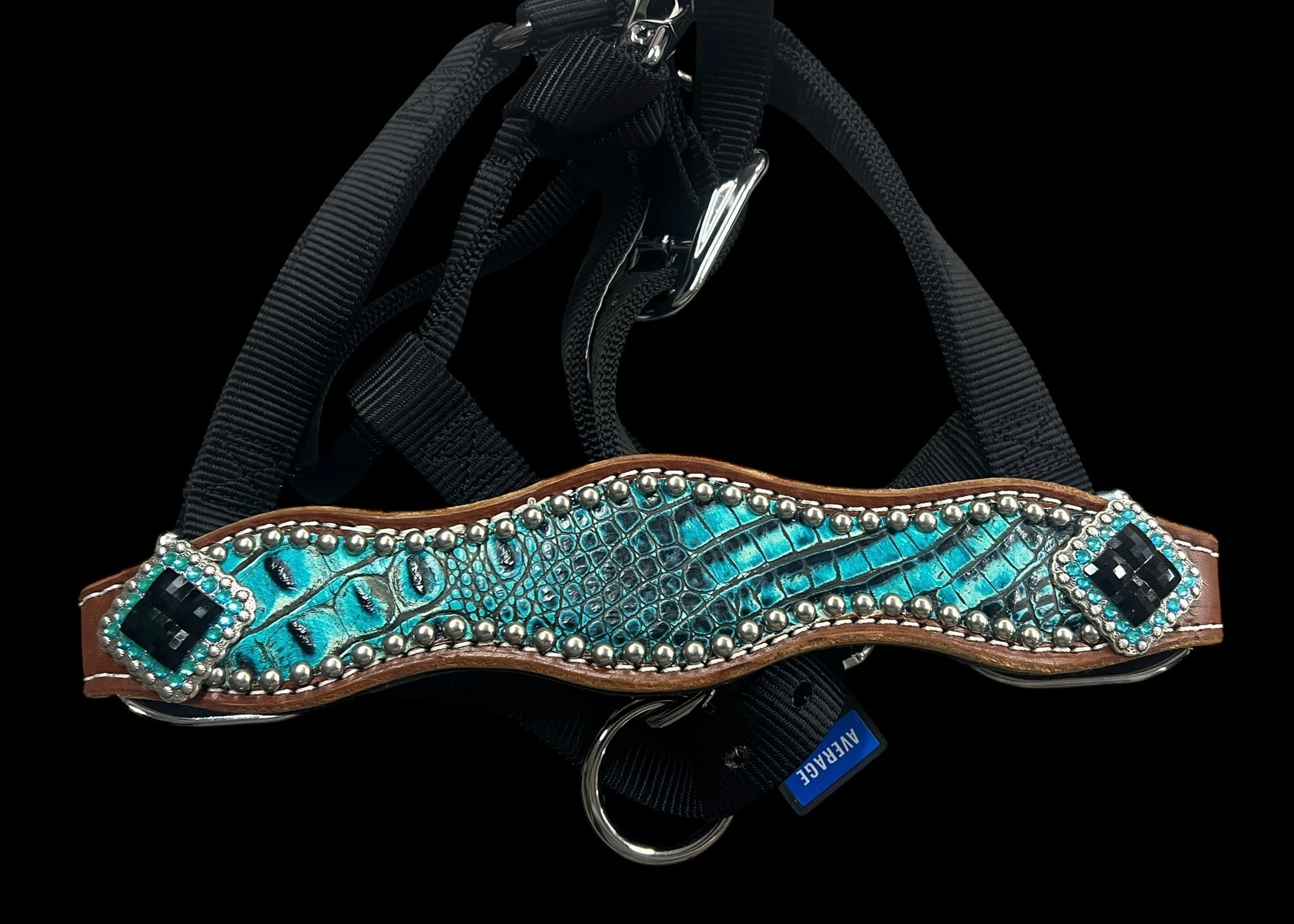 This ensemble features chocolate english bridle leather with purple and brown cowboy floral embossed overlay, copper spots, and conchos with genuine rhinestones.