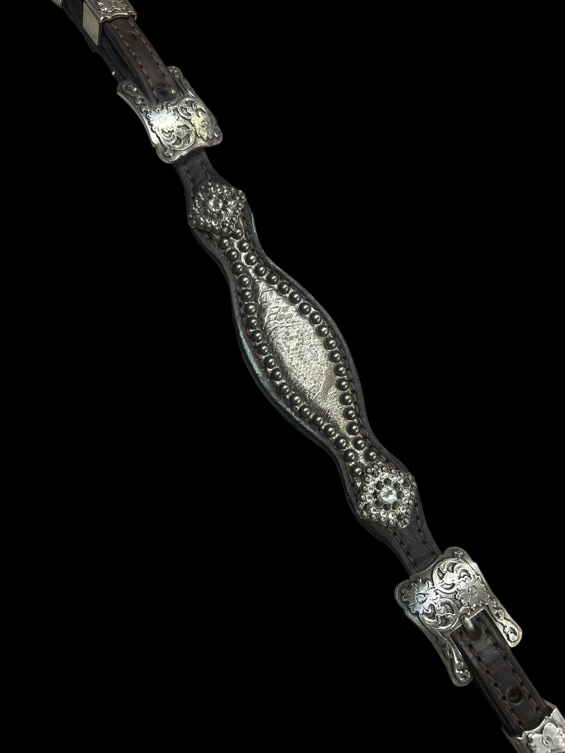This ensemble features dark english bridle leather with grey and silver snake embossed leather overlay, antique spots, and conchos with genuine rhinestones.