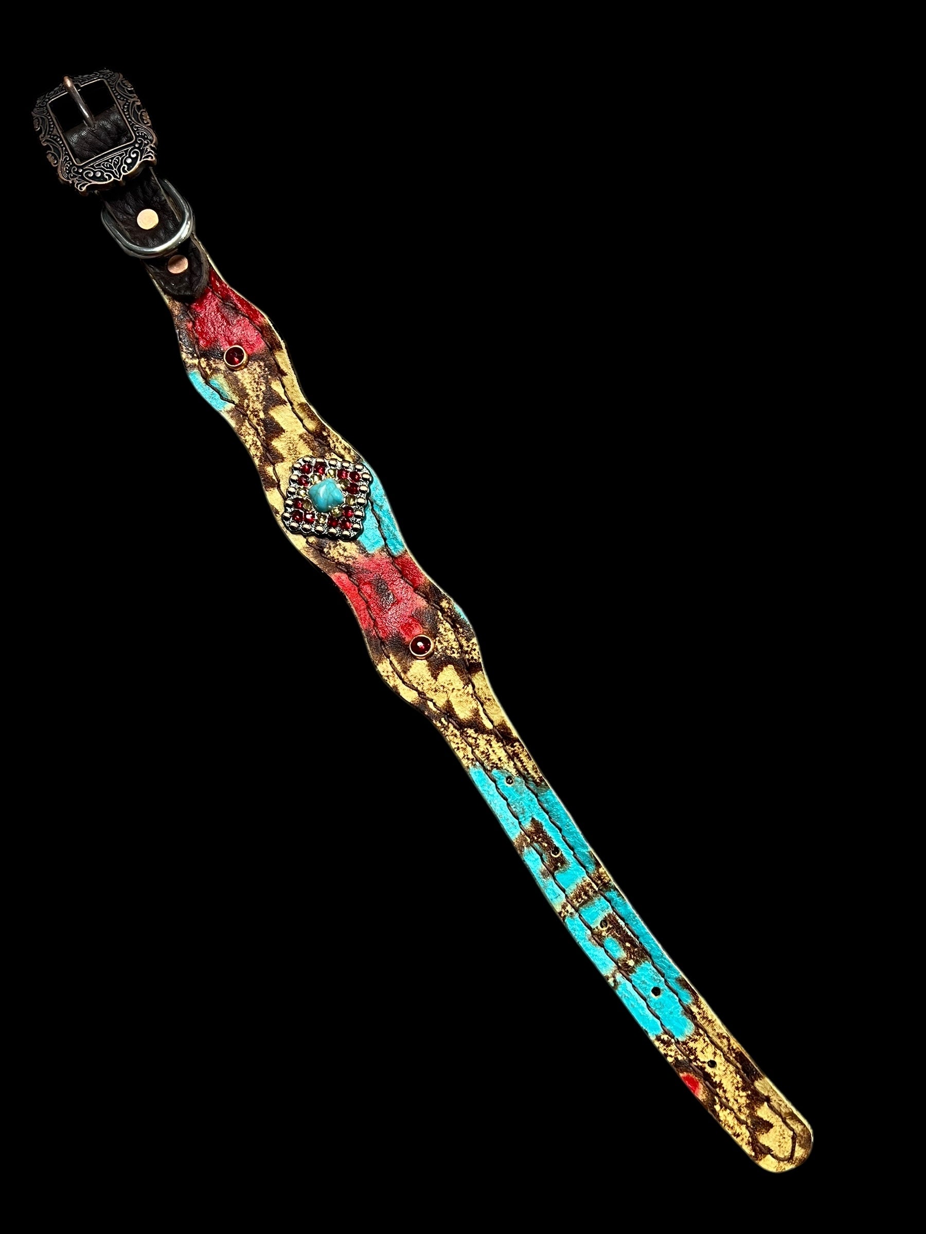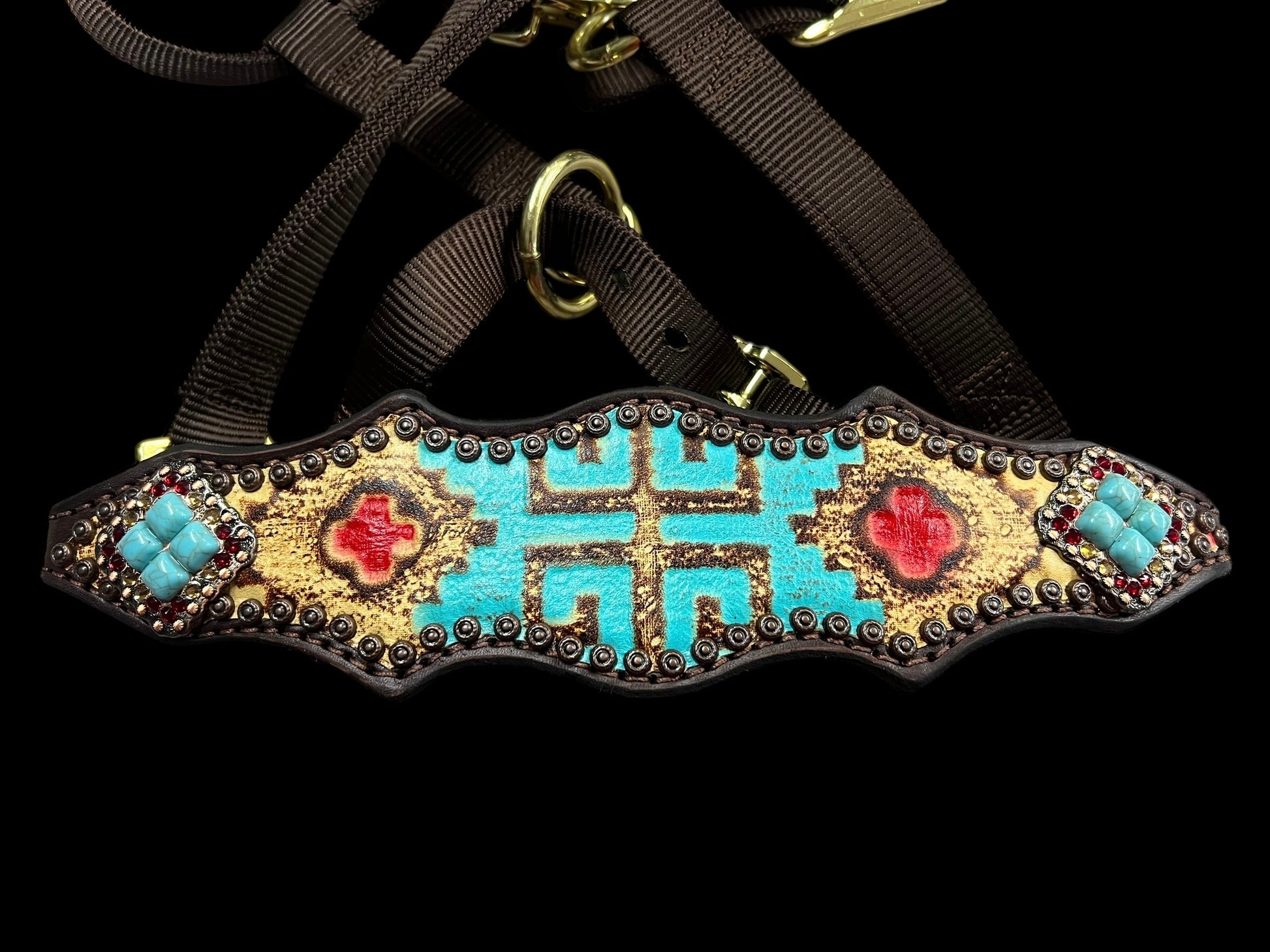 This ensemble features chocolate english bridle leather with tan, red, and turquoise Taos embossed leather overlay, copper spots, and conchos with genuine rhinestones and turquoise squares.