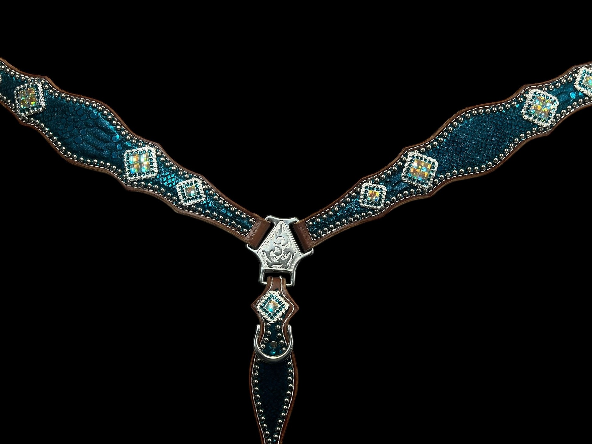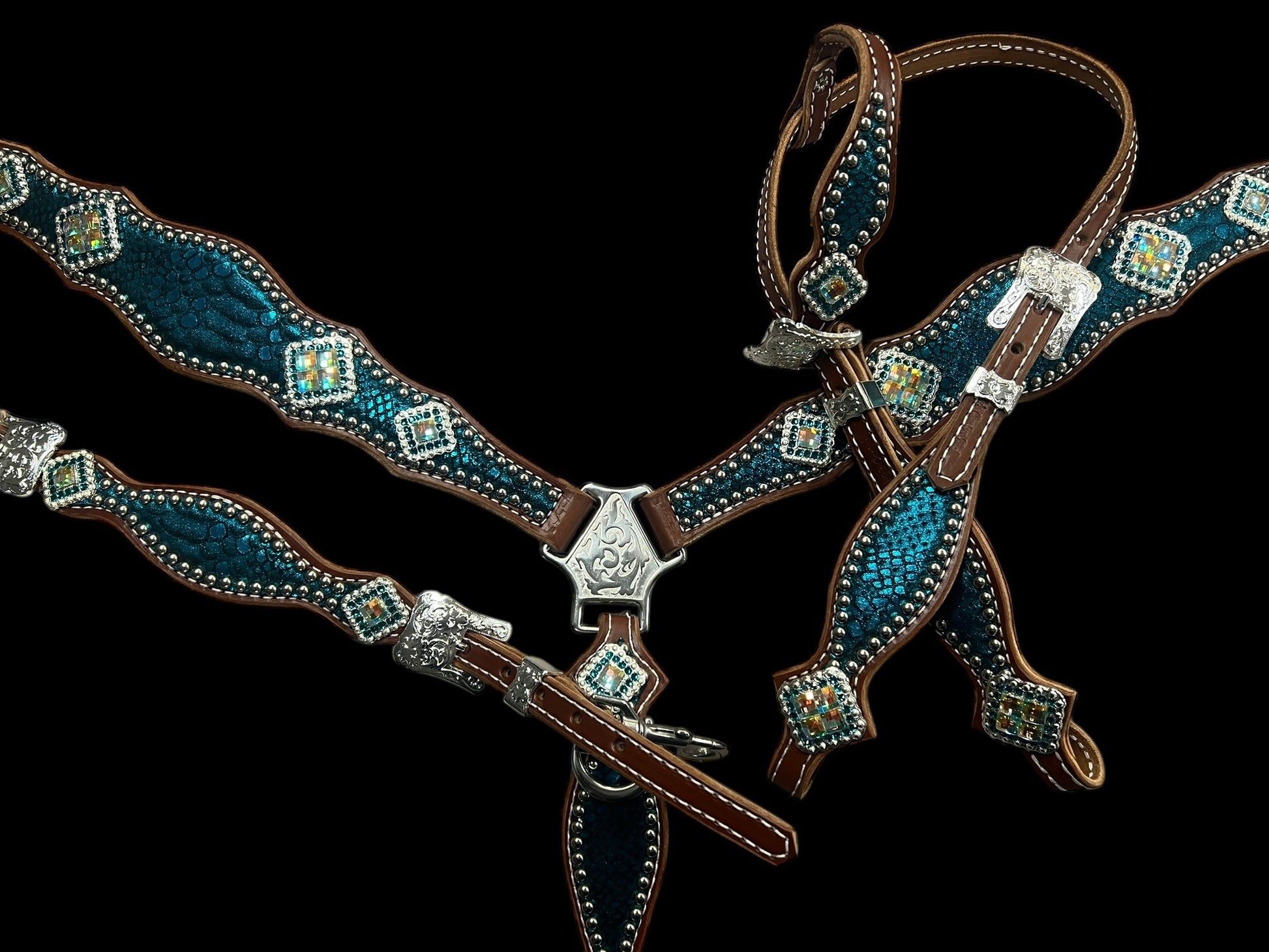 This ensemble features medium english bridle leather with teal mystic suede leather overlay, stainless spots, and conchos with genuine rhinestones.