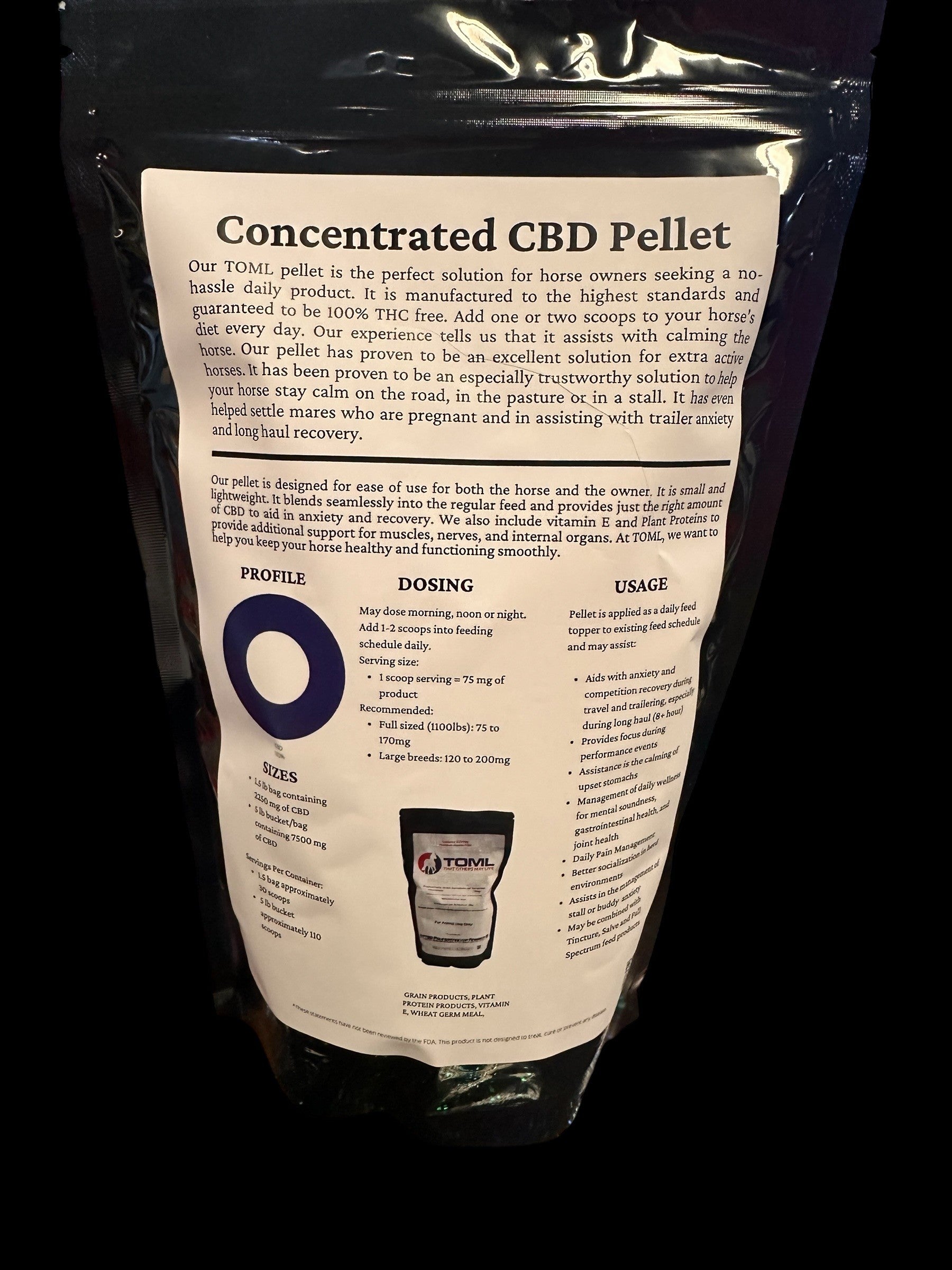 Guaranteed to be 100% THC free the TOML pellet is the perfect fit for horse owners seeking no hassle daily product. This pellet is manufactured to the highest standards and one to two scoops added daily proves to be an excellent solution for those boarding horses and our heavy traveling customers dealing with trailer anxiety and long haul recovery from state to state.
