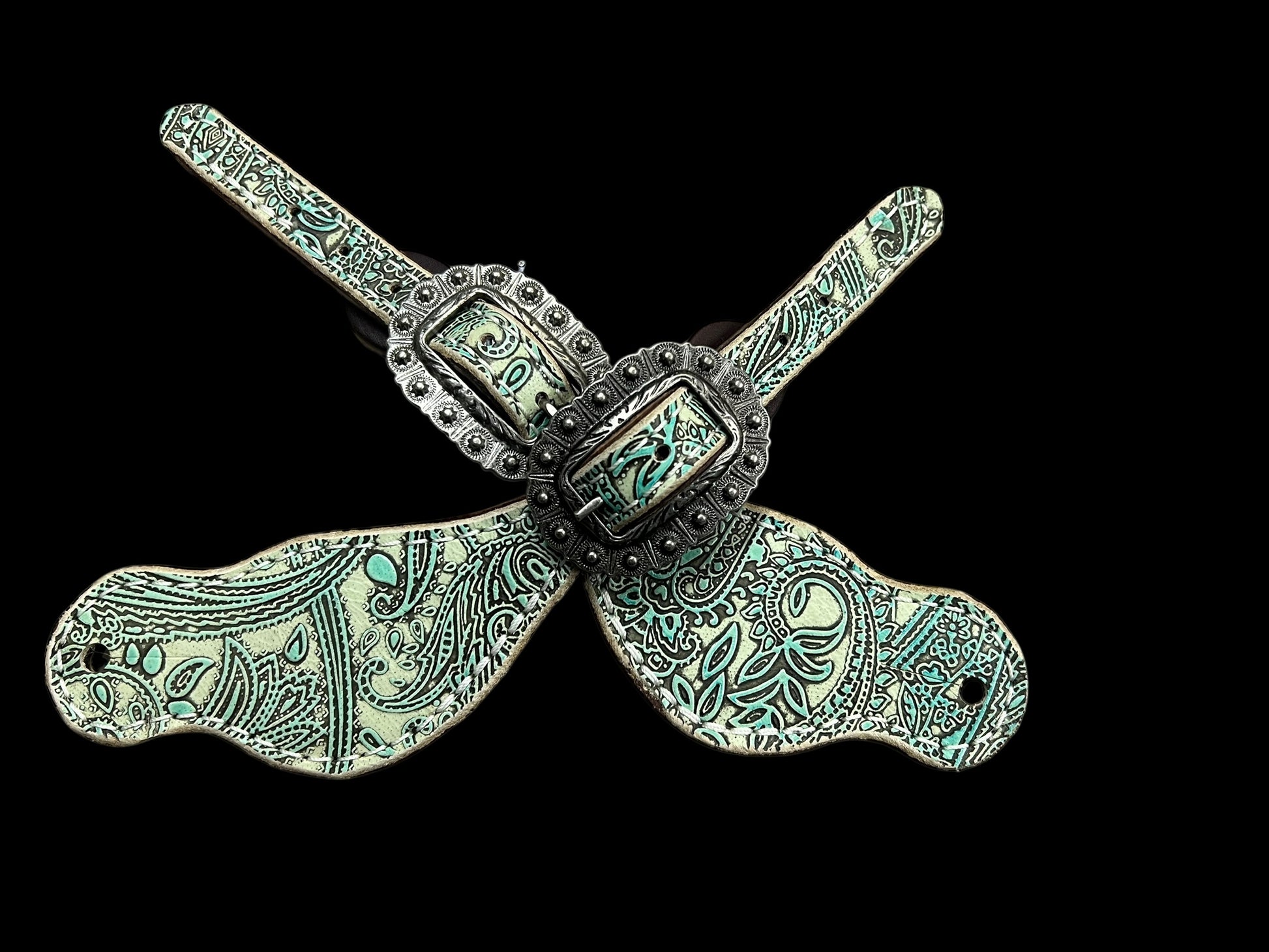 This ensembles features dark brown English bridle leather with mint paisley embossed overlay, antique silver spots, and conchos with Swarovski rhinestones.