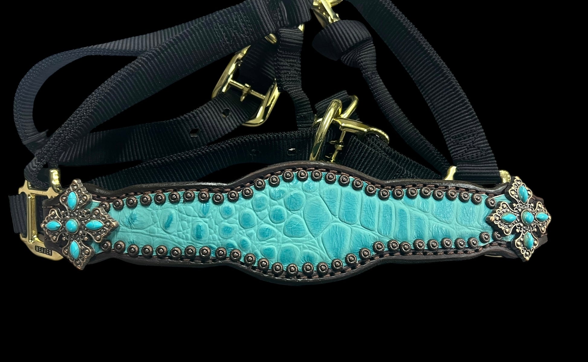 This ensemble features chocolate english bridle leather with turquoise gator embossed leather overlay, copper spots, and conchos with turquoise stones.