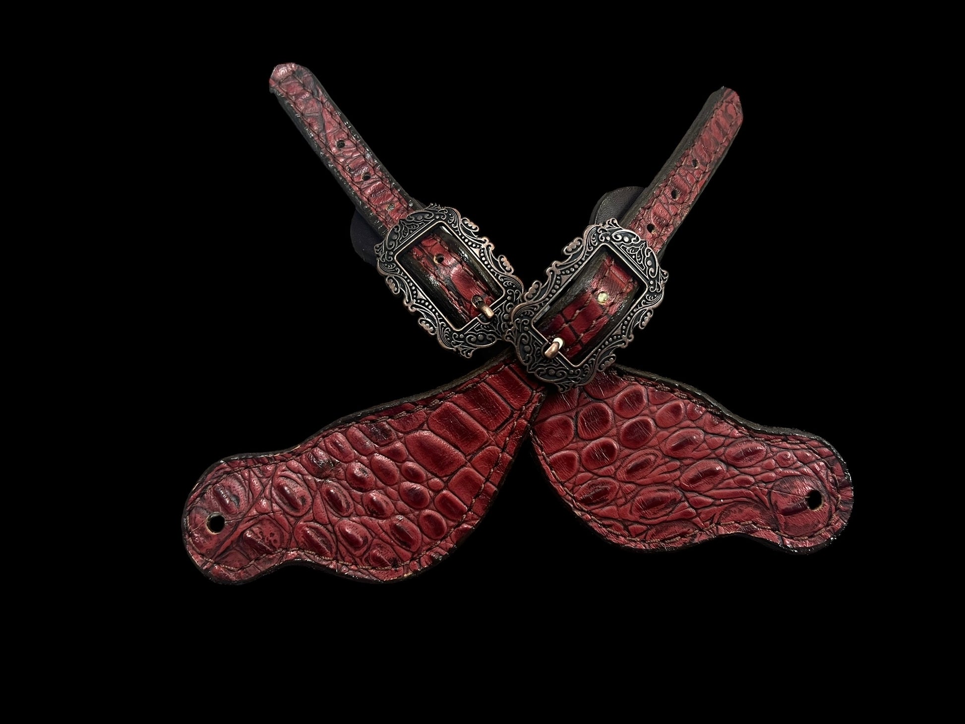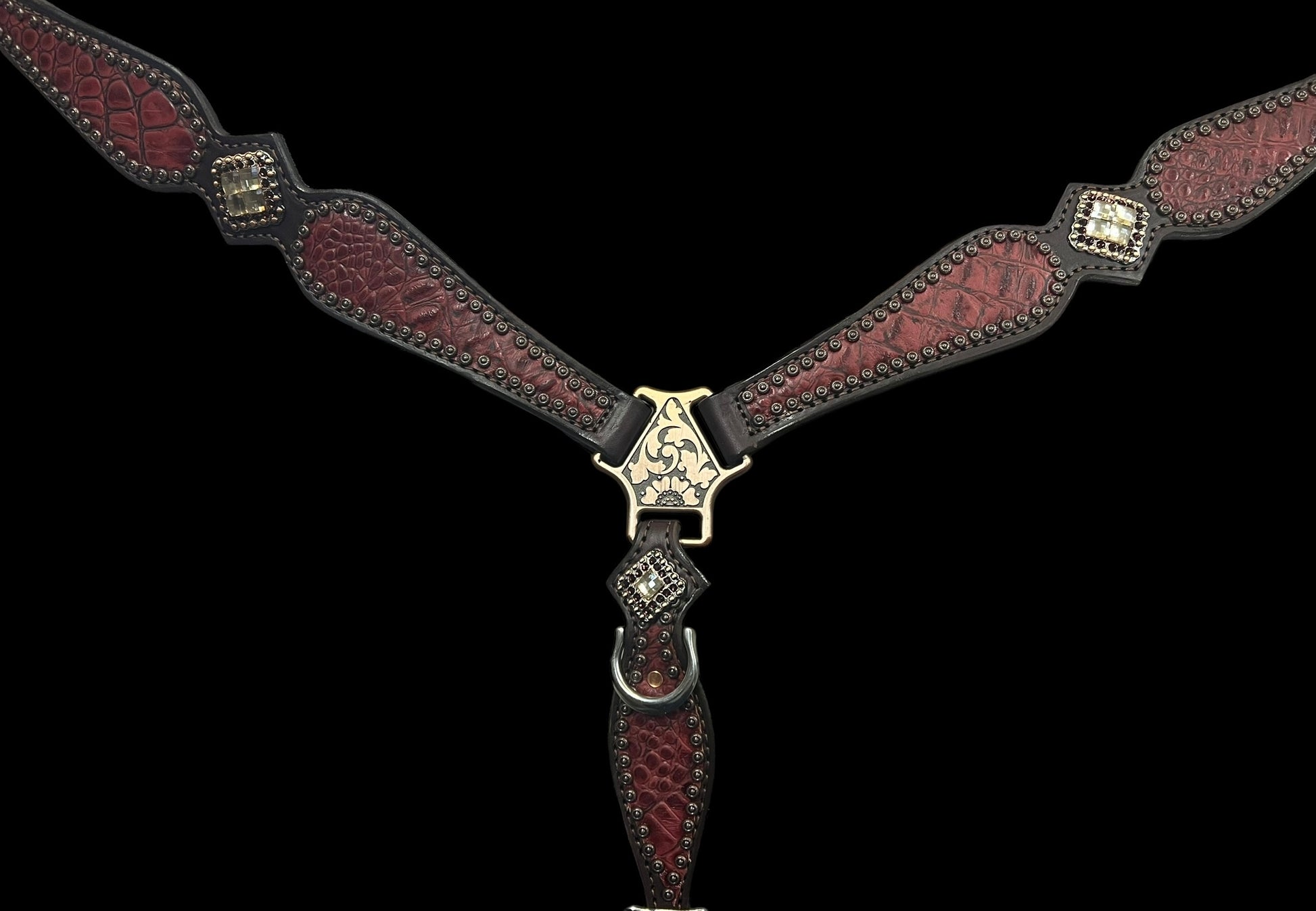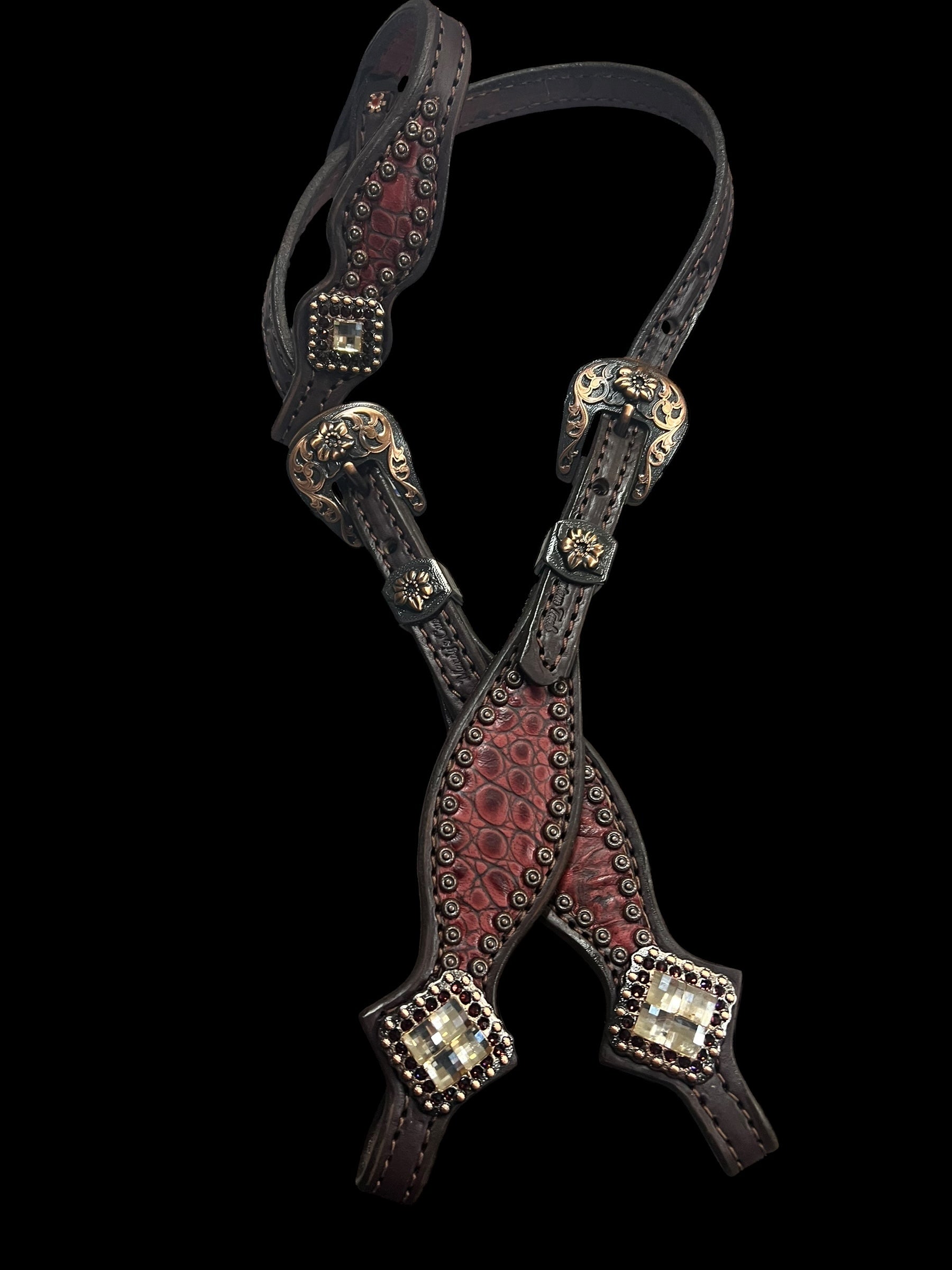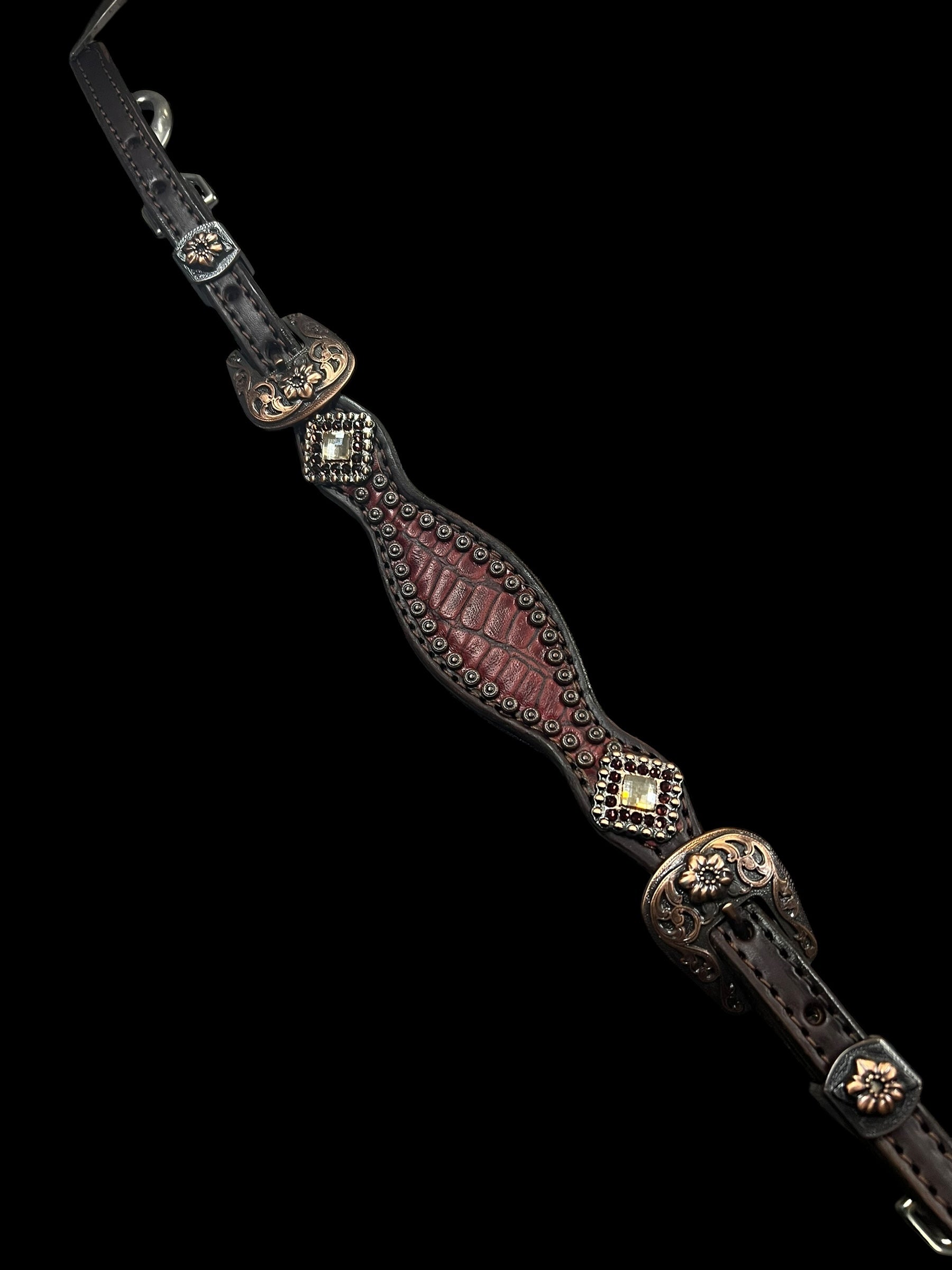 This ensemble features dark chocolate english bridle leather with wine gator embossed leather overlay, copper spots, and conchos with genuine rhinestones .